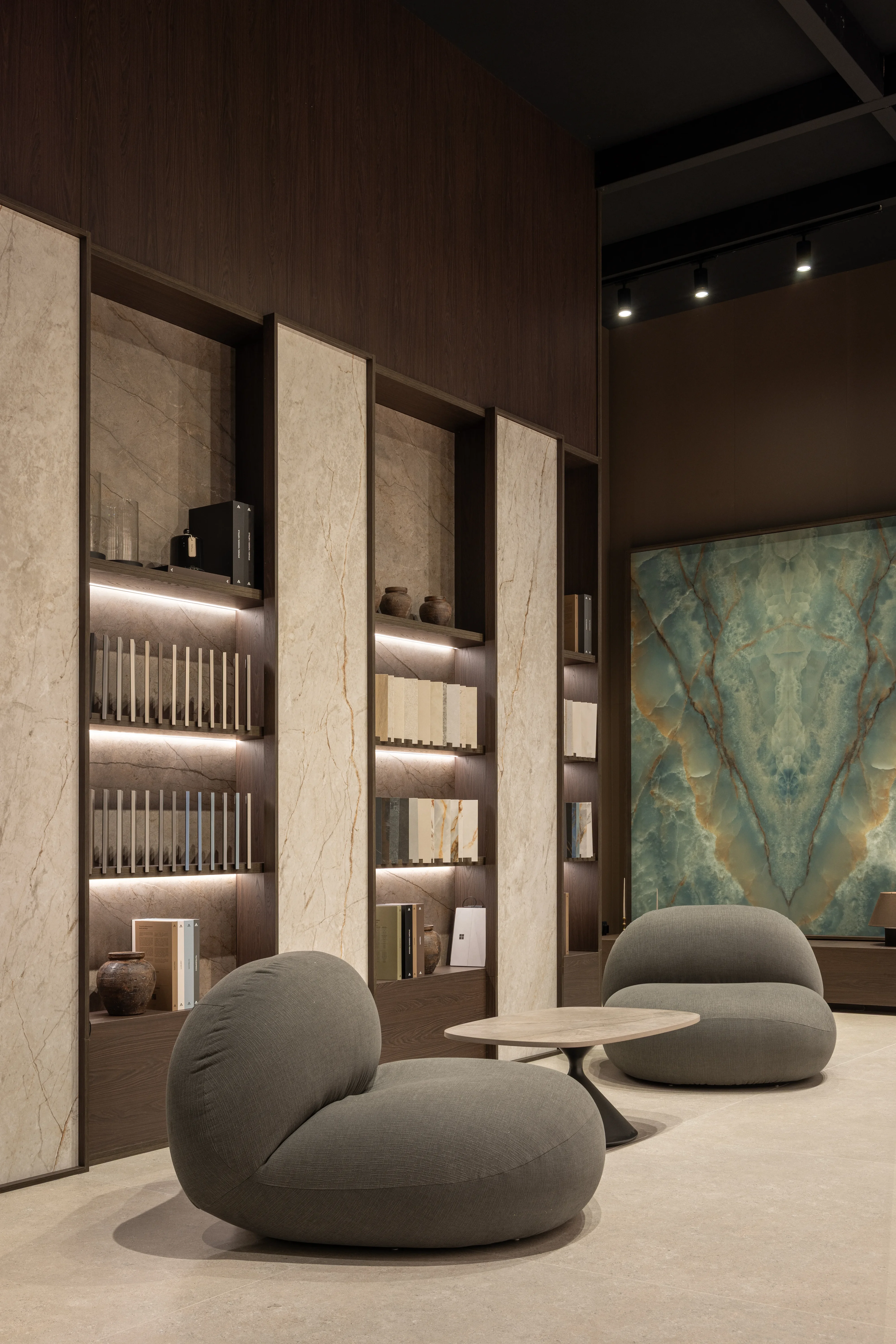 El uso de iluminación integrada, elementos naturales y composiciones equilibradas ha transformado el stand en un espacio inmersivo. La combinación de materiales, colores y volúmenes ha generado una atmósfera cálida y elegante, pensada para conectar con el visitante.
