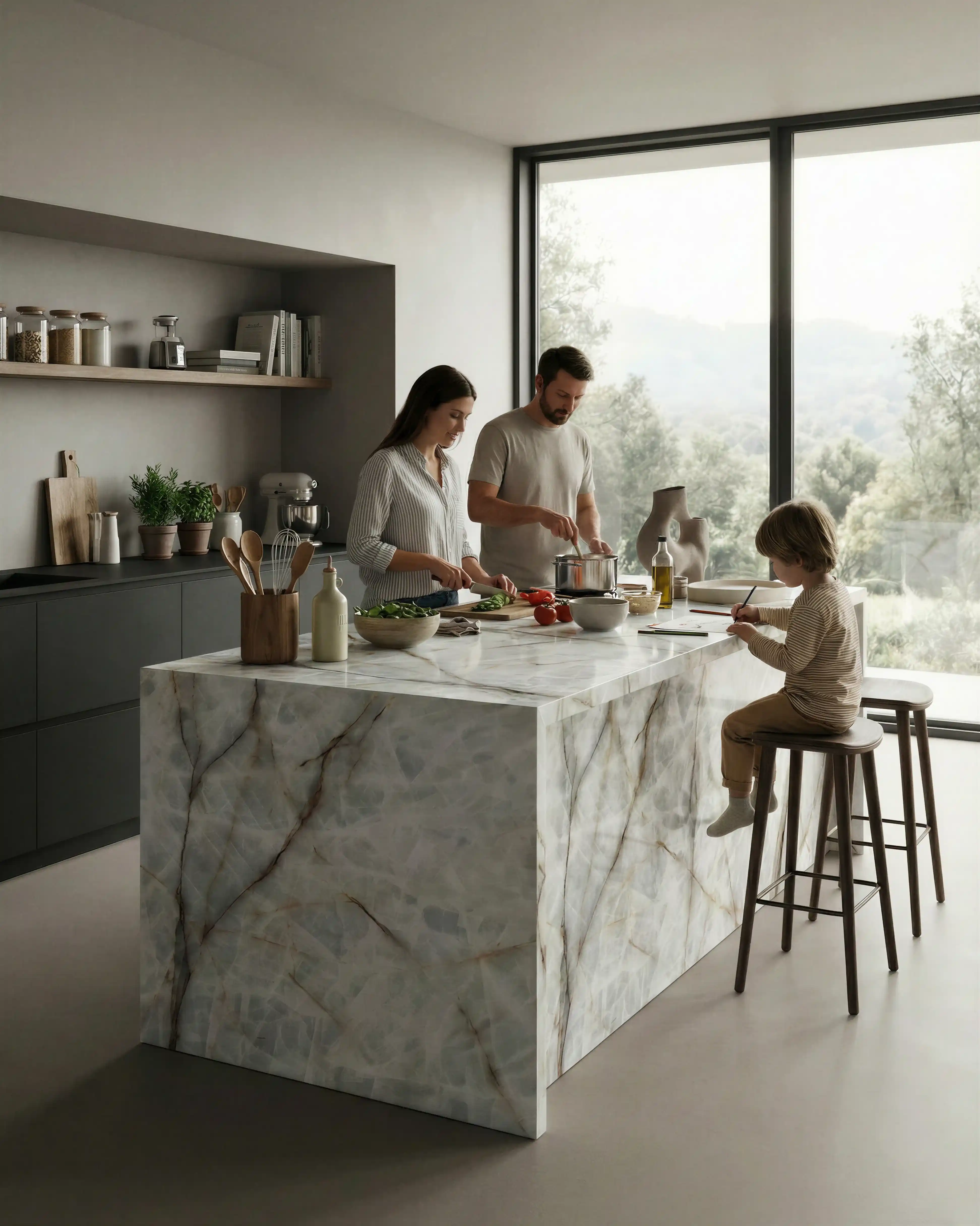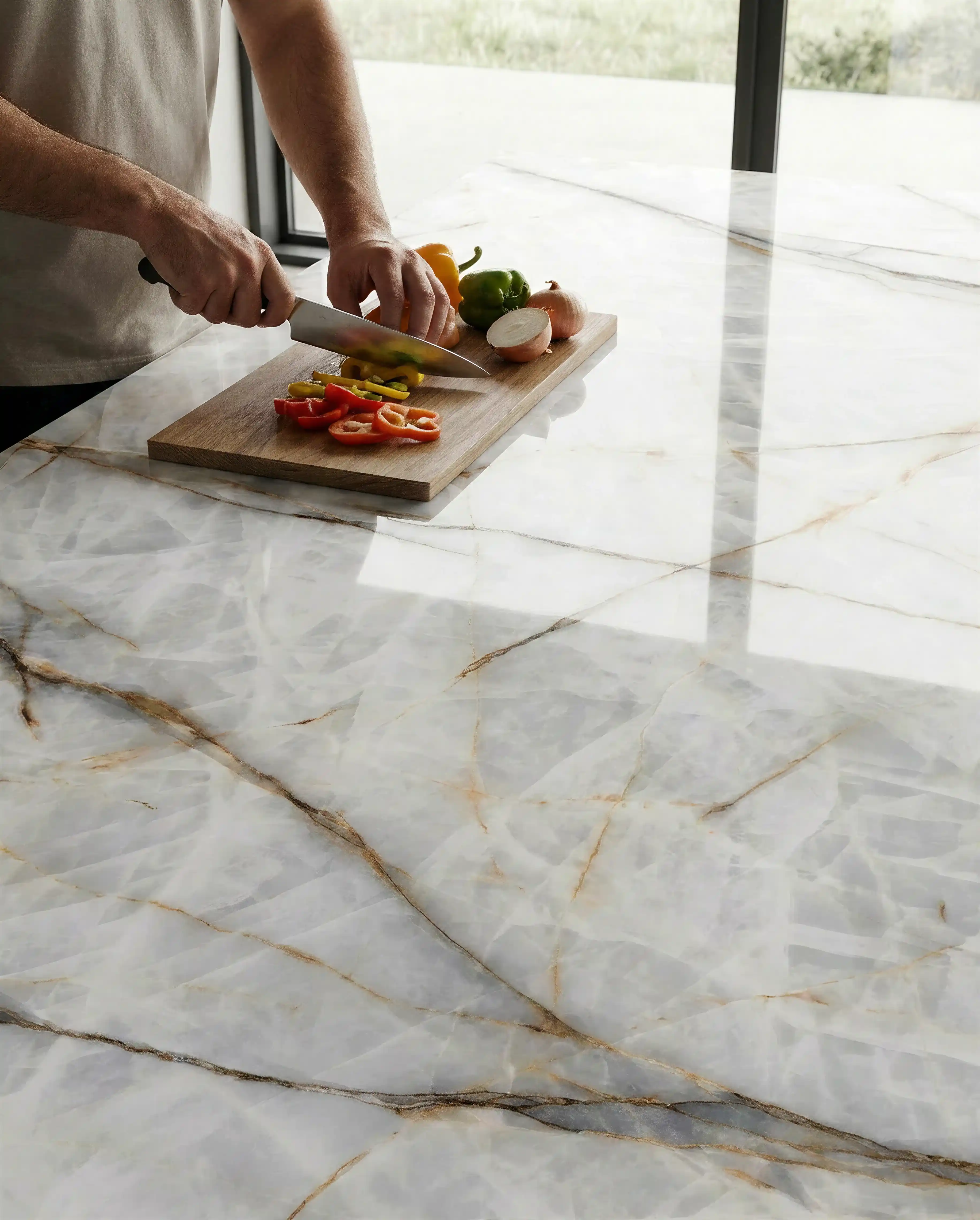 Така всяко пространство се трансформира, придобивайки дълбочина и характер, които предизвикват чиста изтънченост. Жилките, като златни и опушени нишки, не само украсяват, но насочват погледа, създавайки визуална текстура, която добавя динамика на всяко пространство.