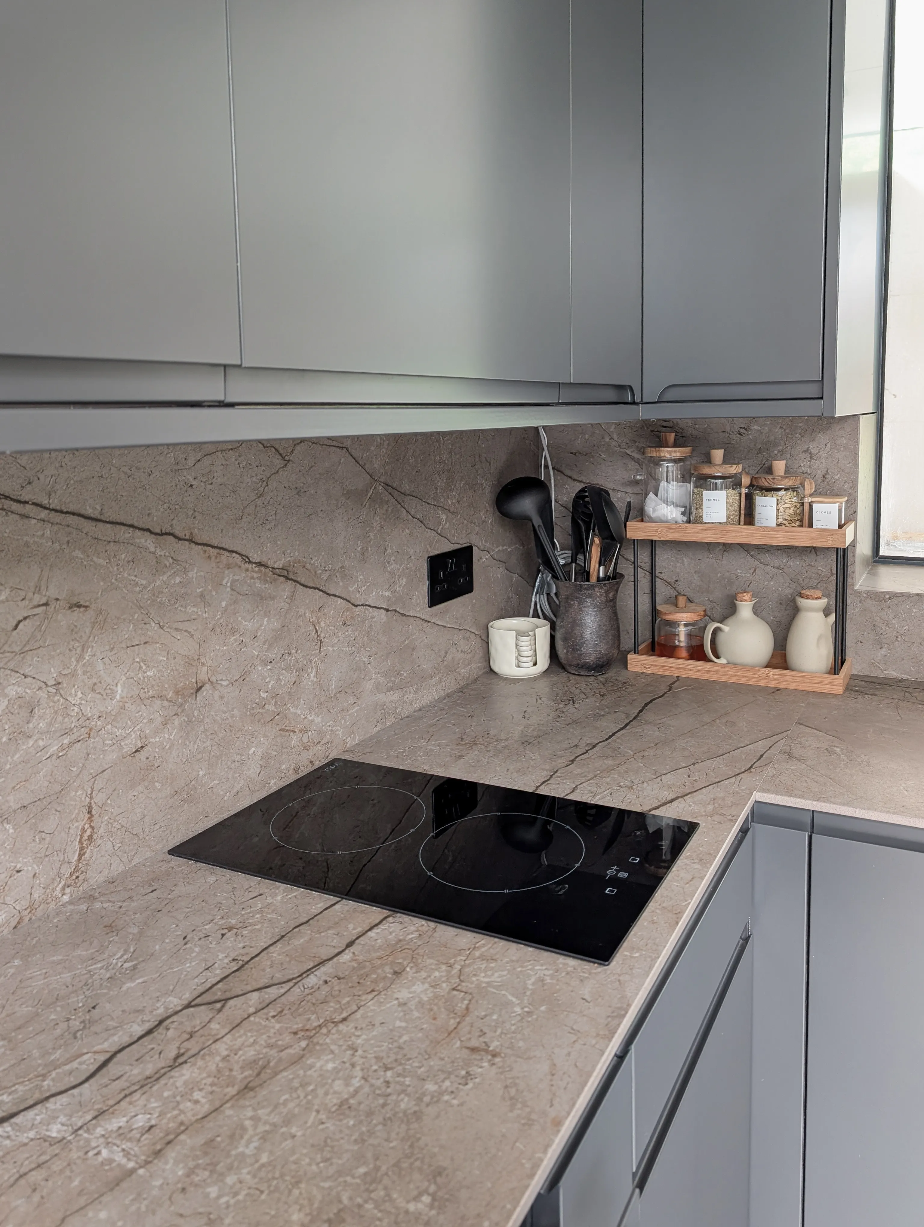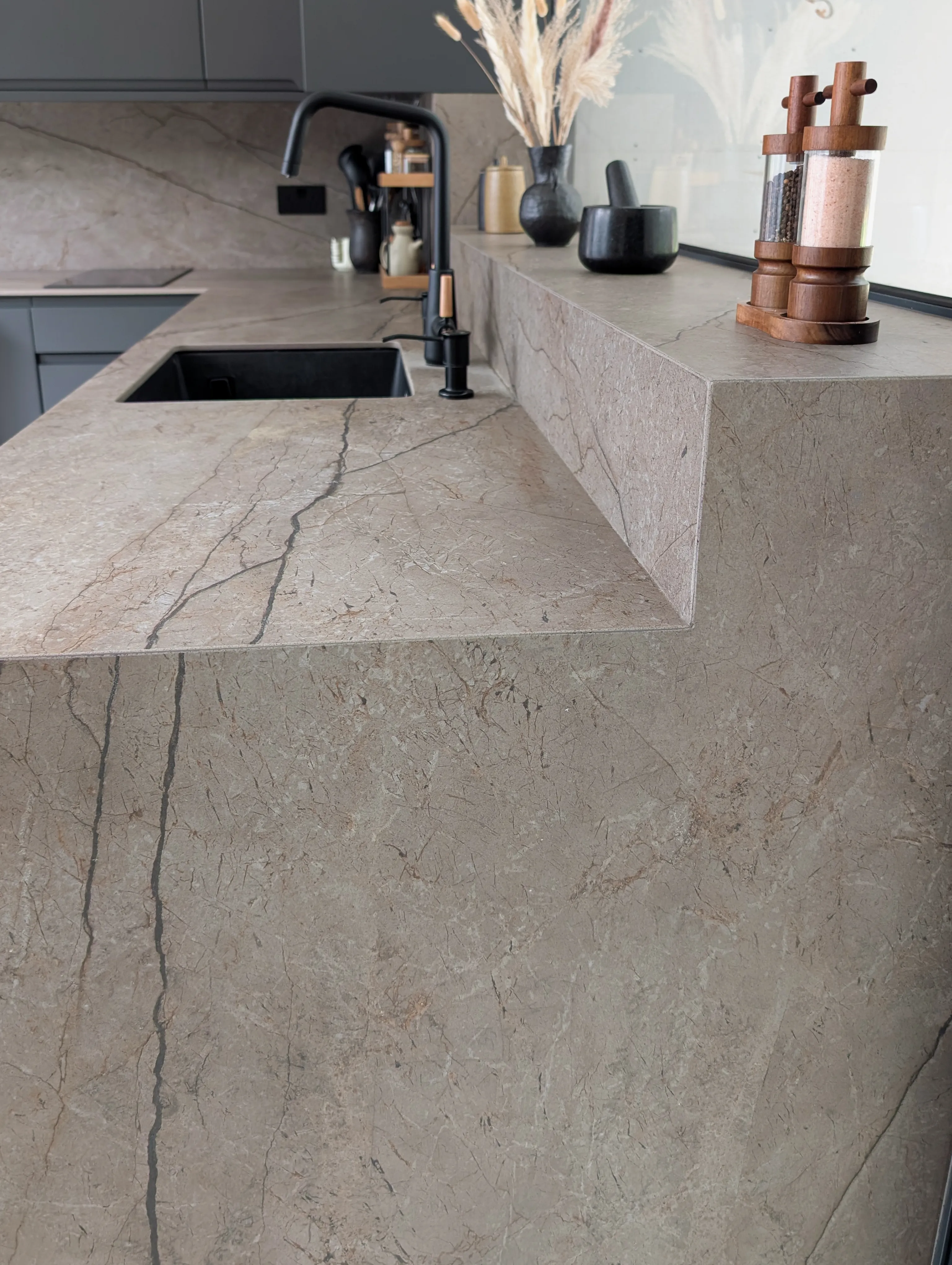 La continuidad del Nebula Brown es un eje central: en la zona de la ventana, la encimera se eleva para crear un alféizar integrado que funciona como estante, extendiendo la textura del producto. El mobiliario se ha seleccionado en gris oscuro mate para establecer un fuerte contraste cromático. Este tono neutro permite que la riqueza del veteado del Nebula Brown sea el foco visual del espacio, aportando sobriedad y modernidad al conjunto.