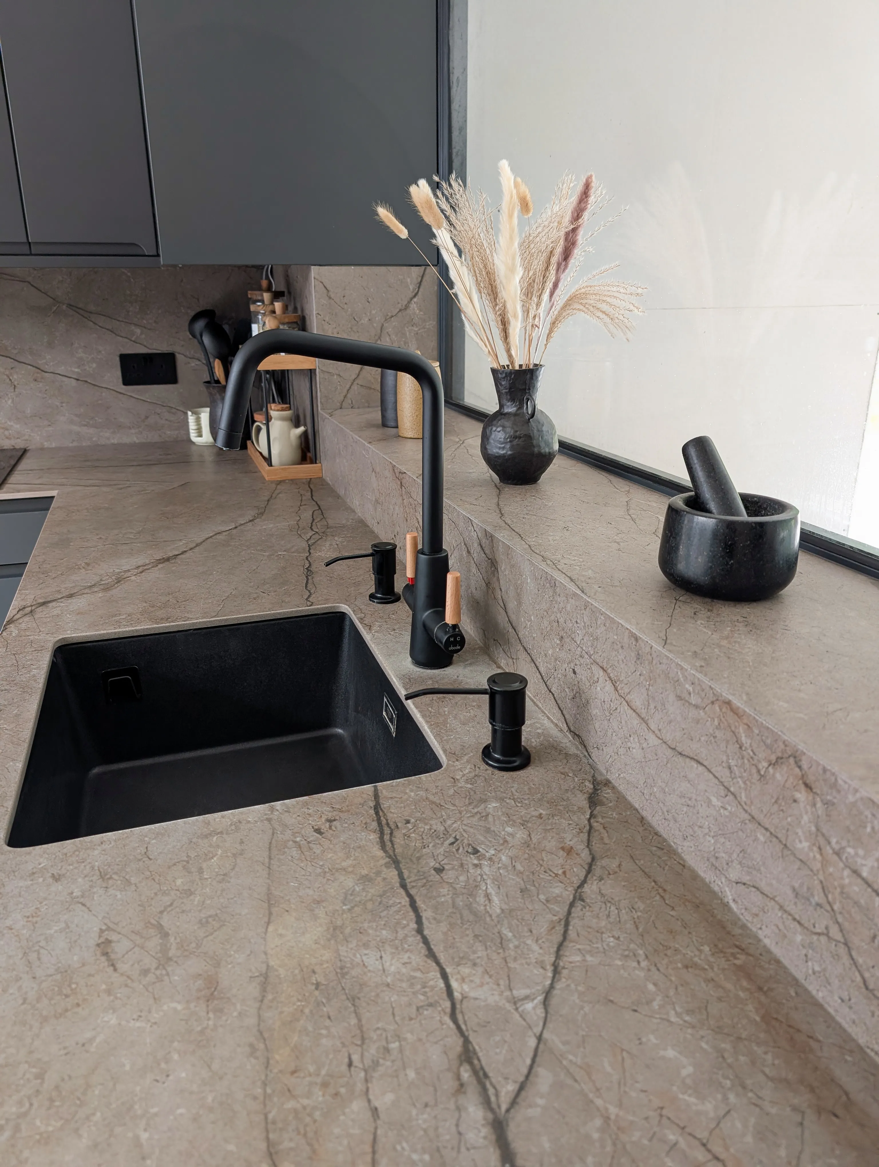 Los componentes funcionales, incluyendo la grifería de caño alto, el fregadero y los dispensadores, están ejecutados en negro mate, manteniendo una línea minimalista y cohesionada. La amplia entrada de luz natural realza la profundidad de la superficie, creando un ambiente de cocina distinguido y altamente funcional. El diseño resultante equilibra la robustez técnica con una estética cálida y moderna.