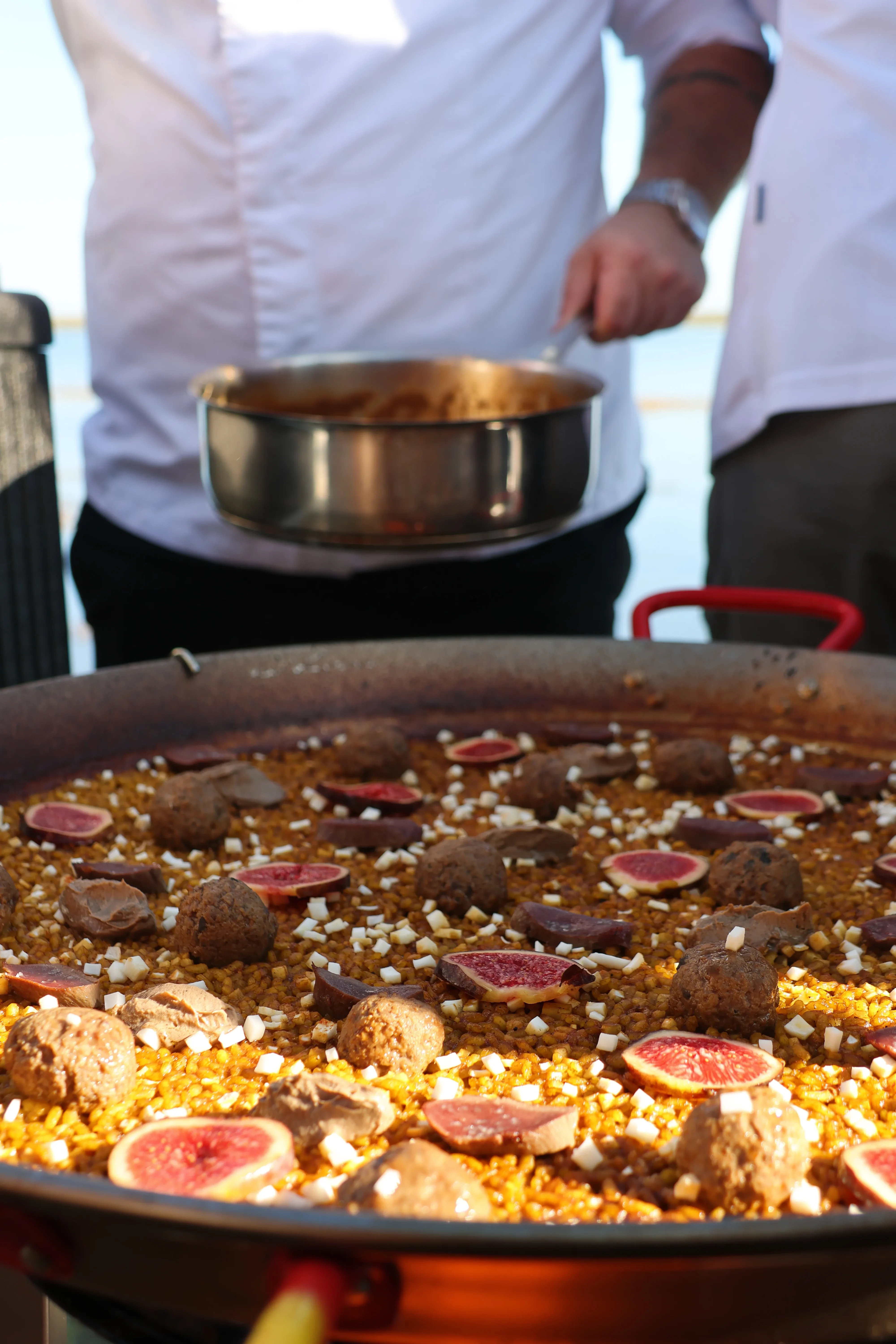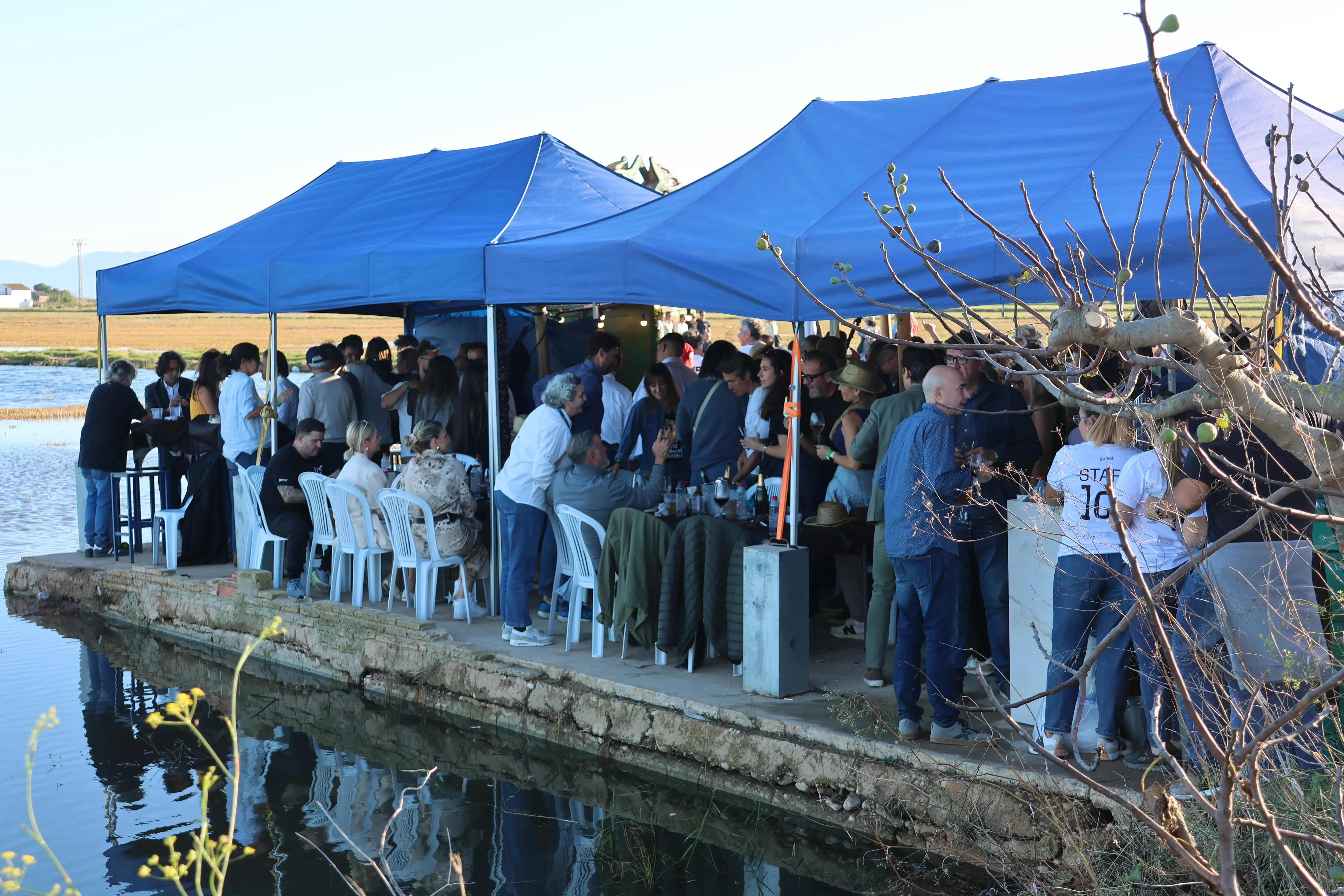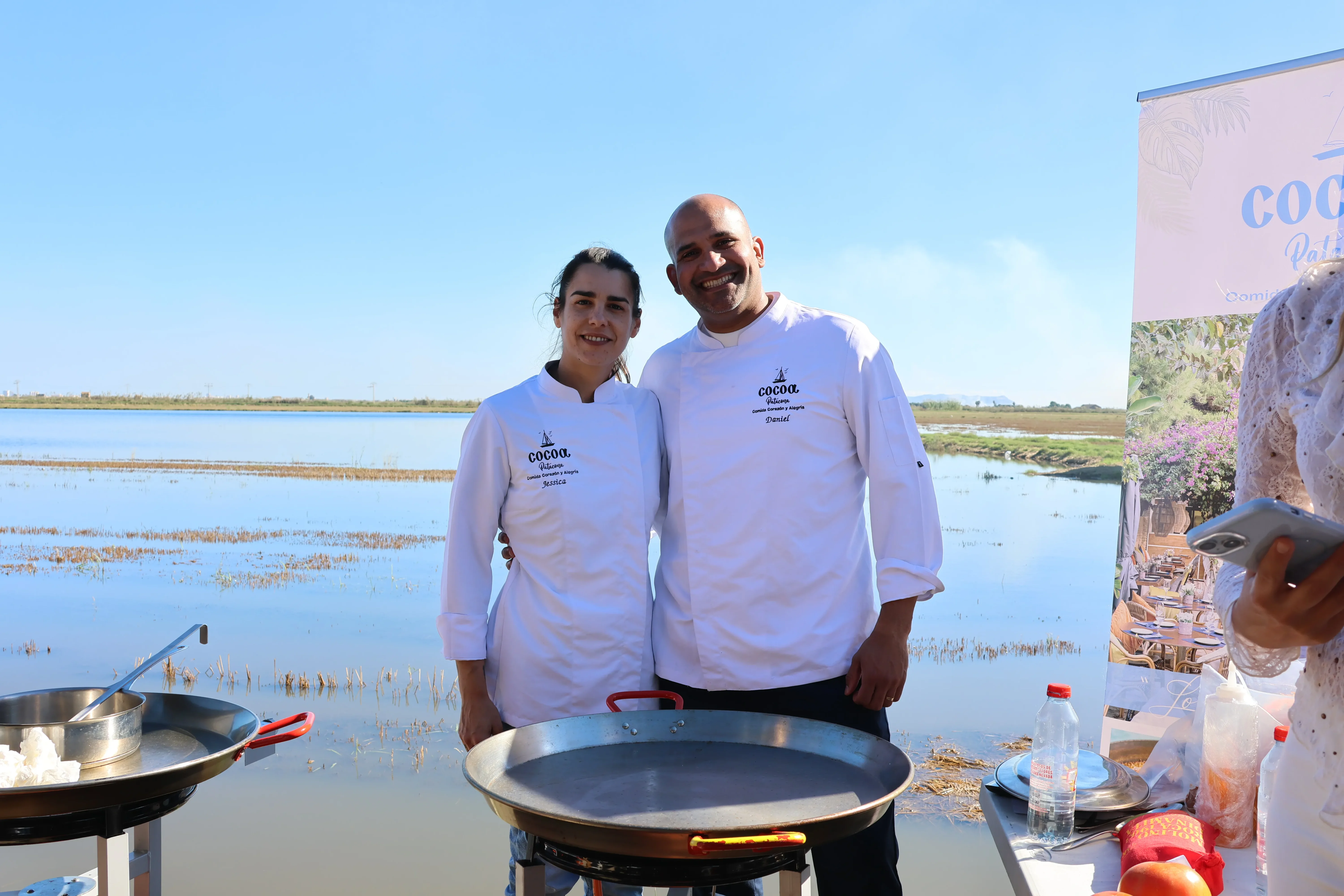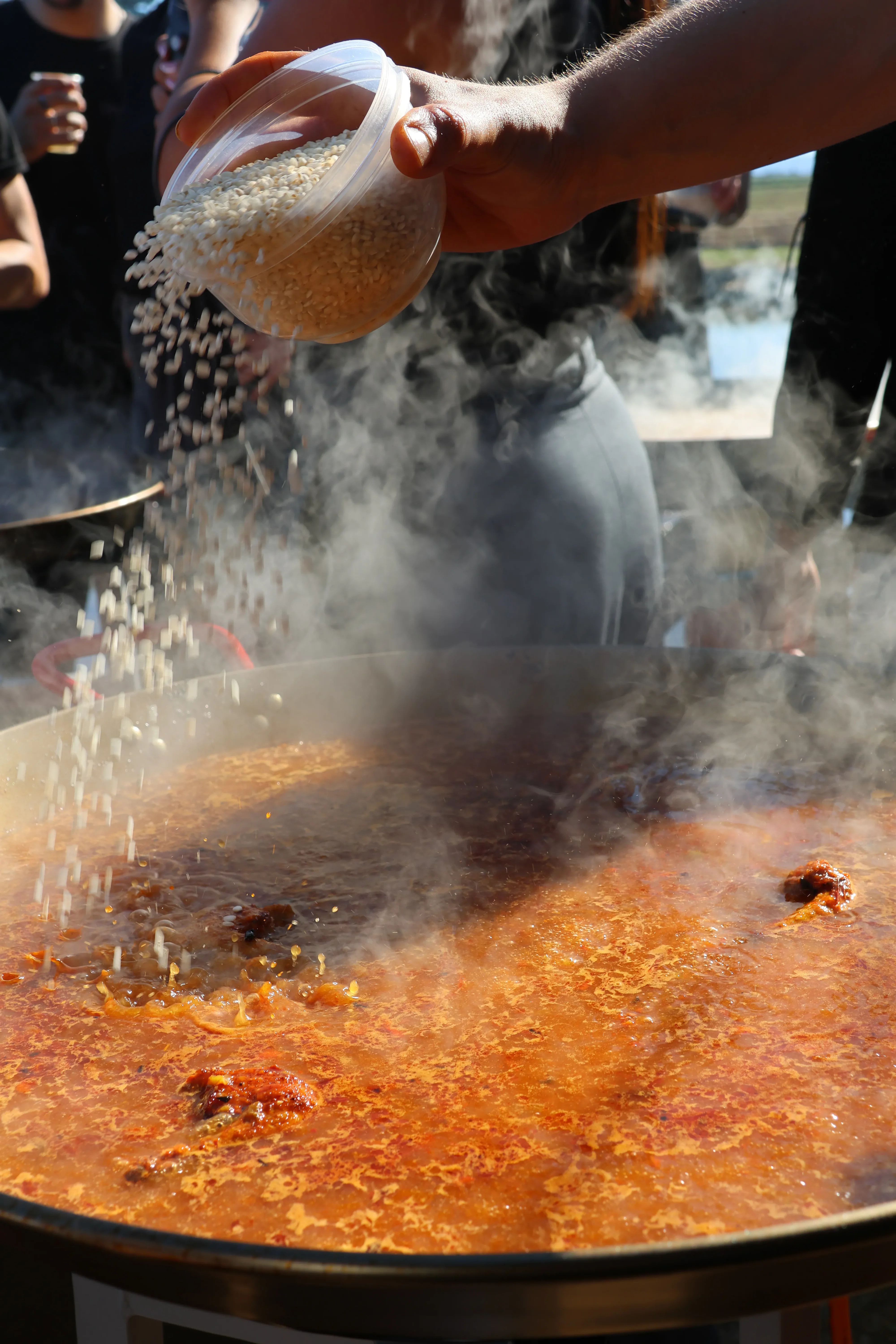 Desde primera hora, el ambiente se impregnaba de expectación y aromas. Más de cincuenta chefs llegados de distintos rincones del país preparaban sus paellas al mismo tiempo, creando una sinfonía de fuego, madera y sabor que envolvía el paisaje. La energía era contagiosa: cocineros, productores, amigos y curiosos compartían sonrisas, historias y brindis bajo el cielo abierto de la Albufera.