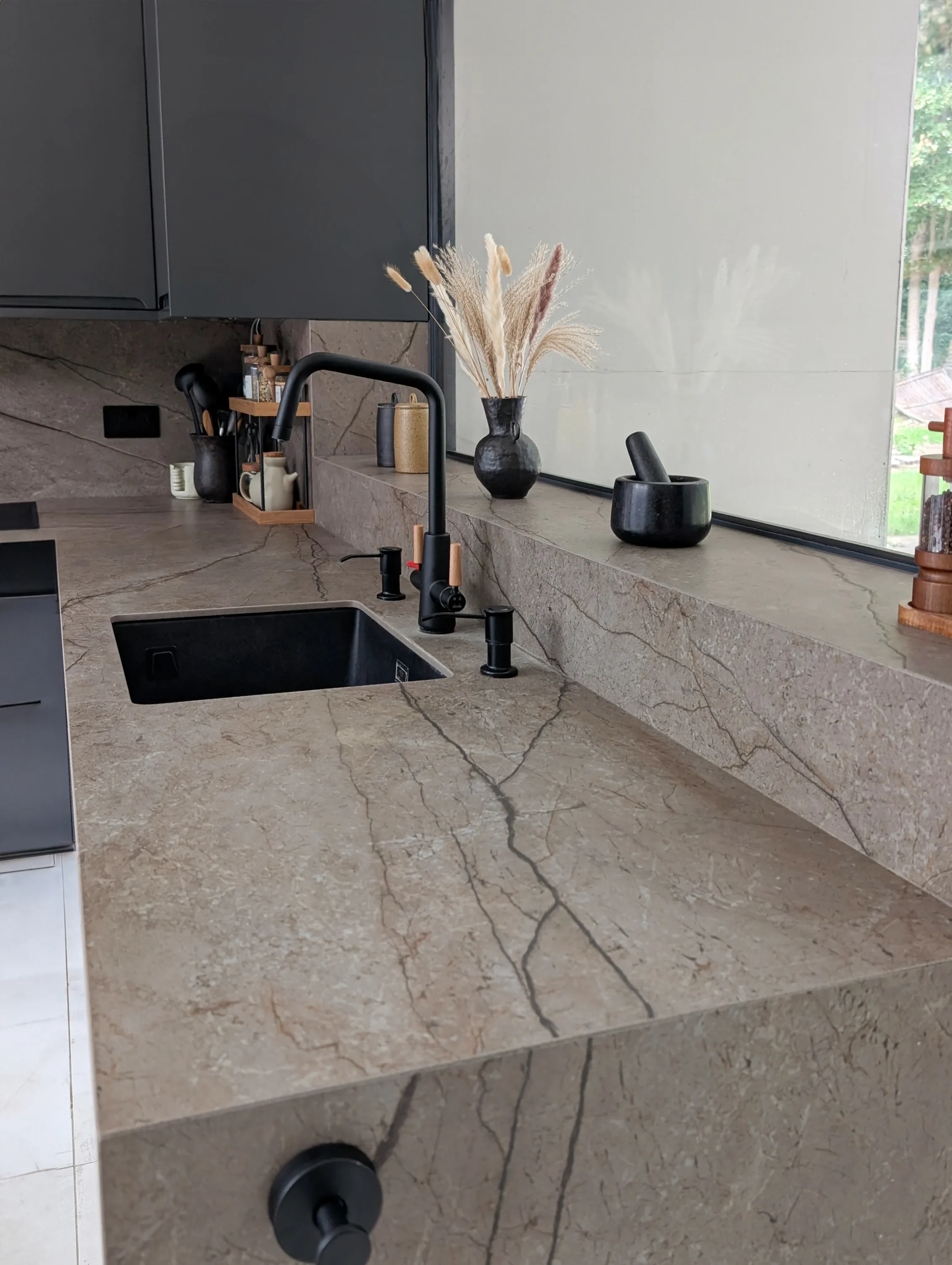 Its manufacturing process is based on the sintering of natural minerals, using high pressure and temperature to produce a high-performance technical material. It is ideal for countertops, façades, flooring, and all types of surfaces, both indoors and outdoors.