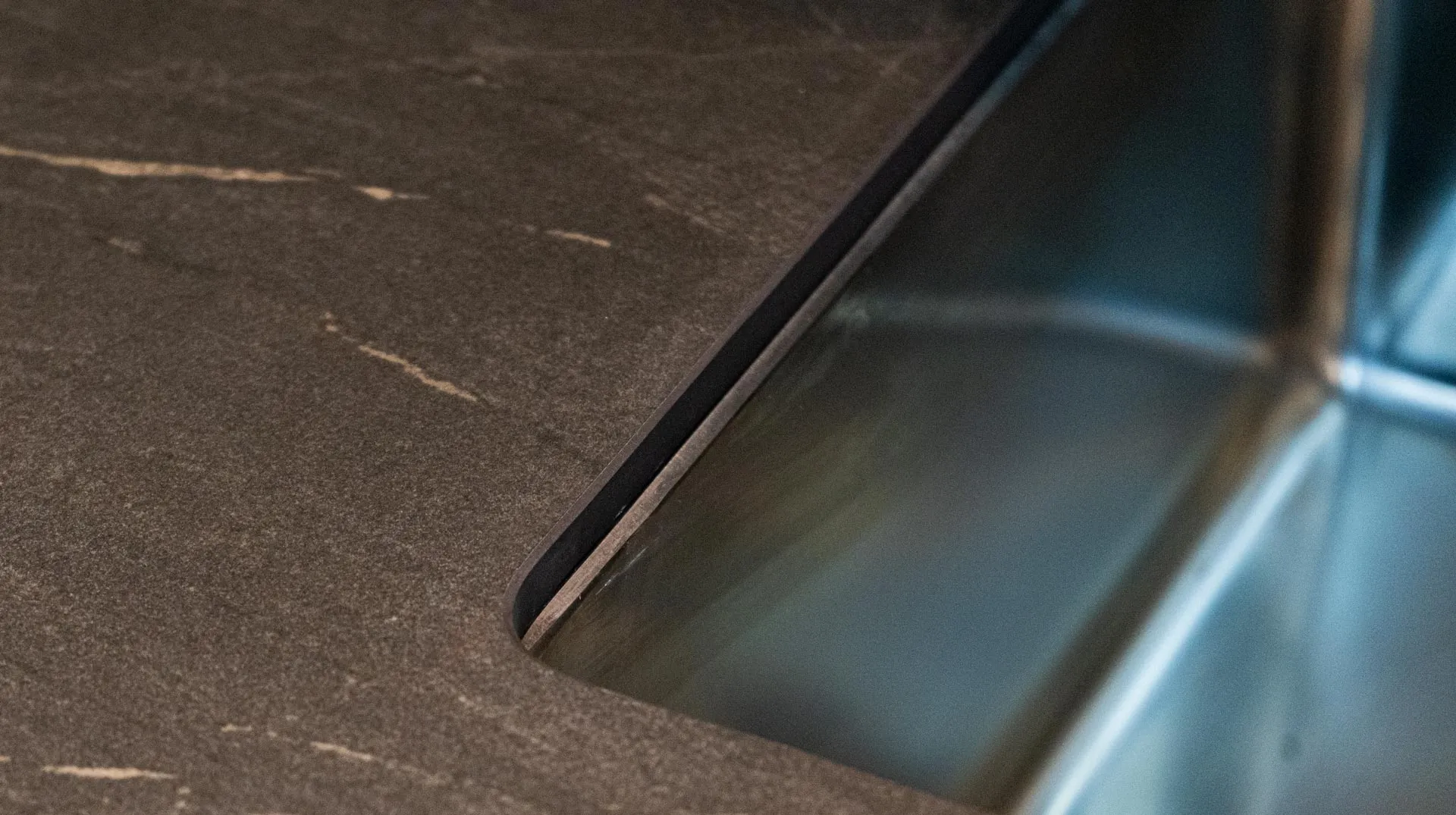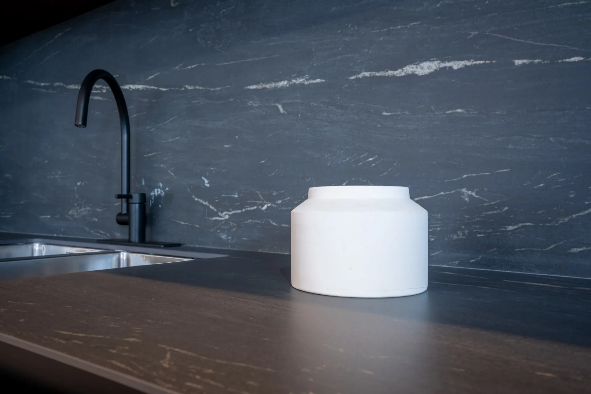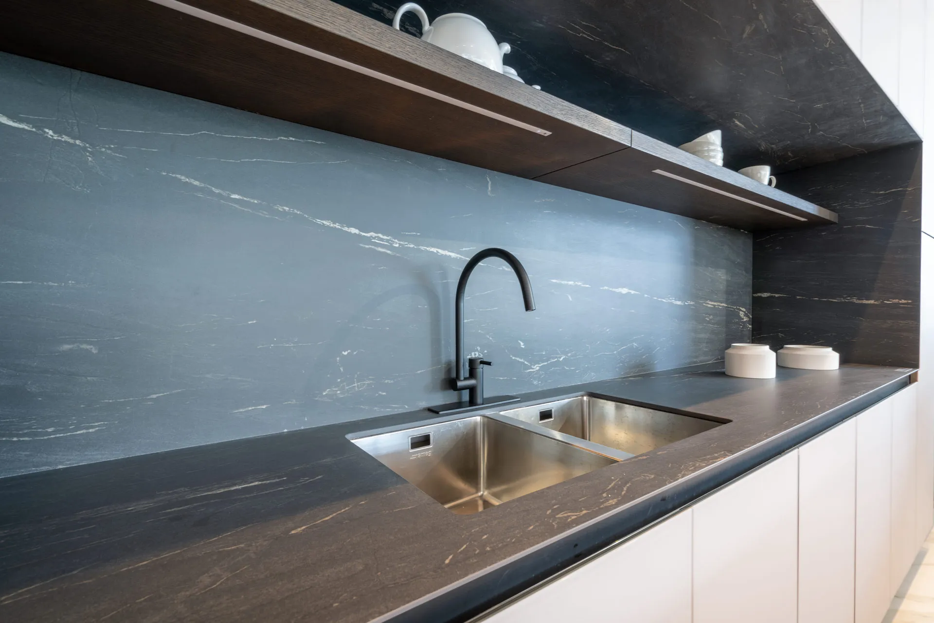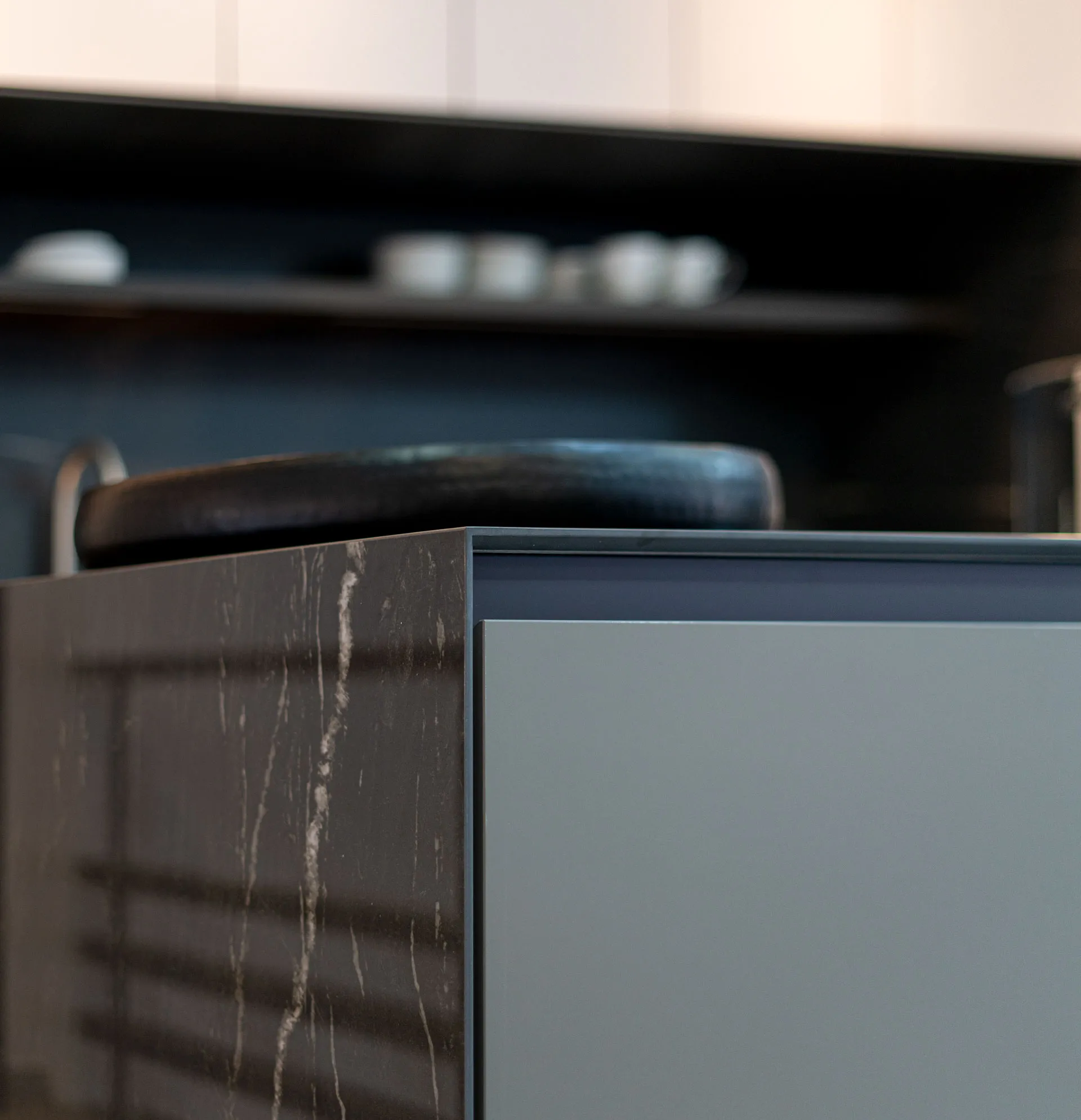 In this kitchen project, our sintered stone Belvedere takes center stage, exploring the beauty of contrast between finishes. The central island, with its polished surface, reflects light and intensifies the dark tones of the stone, making every light vein stand out and turning this element into a true focal point full of presence and sophistication.