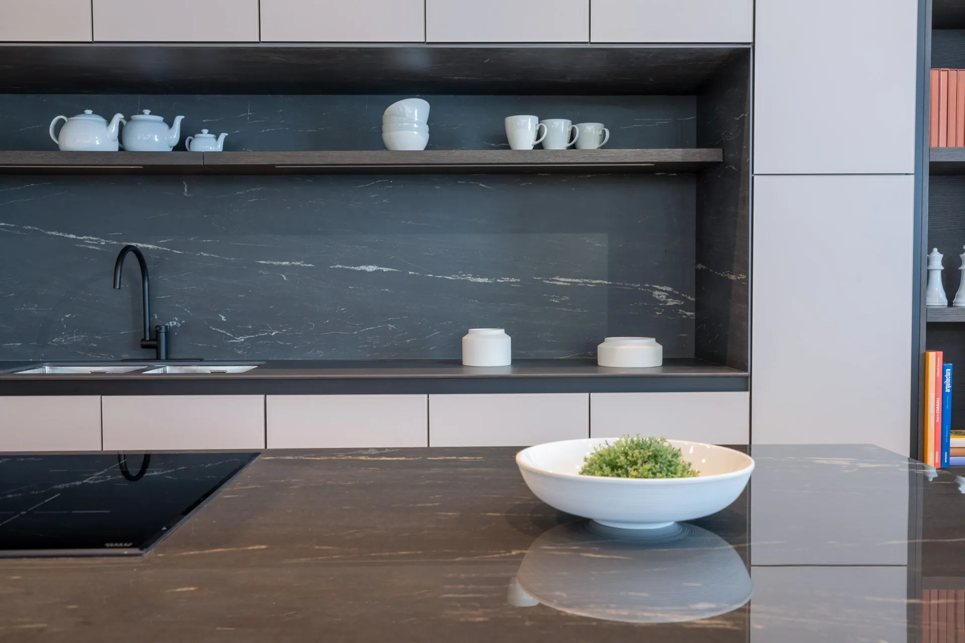 The countertop and backsplash in the sink area, with a matte finish, showcase a deep and tactile texture that invites touch and interaction. This contrast with the polished island provides balance, creating understated and functional elegance that combines practicality with contemporary style.