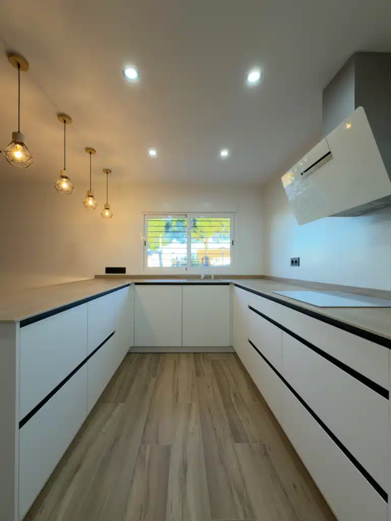 The linear lighting beneath the upper cabinets highlights the texture of the material and casts a warm glow over the work area. The result is a functional and expressive kitchen, where every element contributes to a cohesive space without sacrificing style.