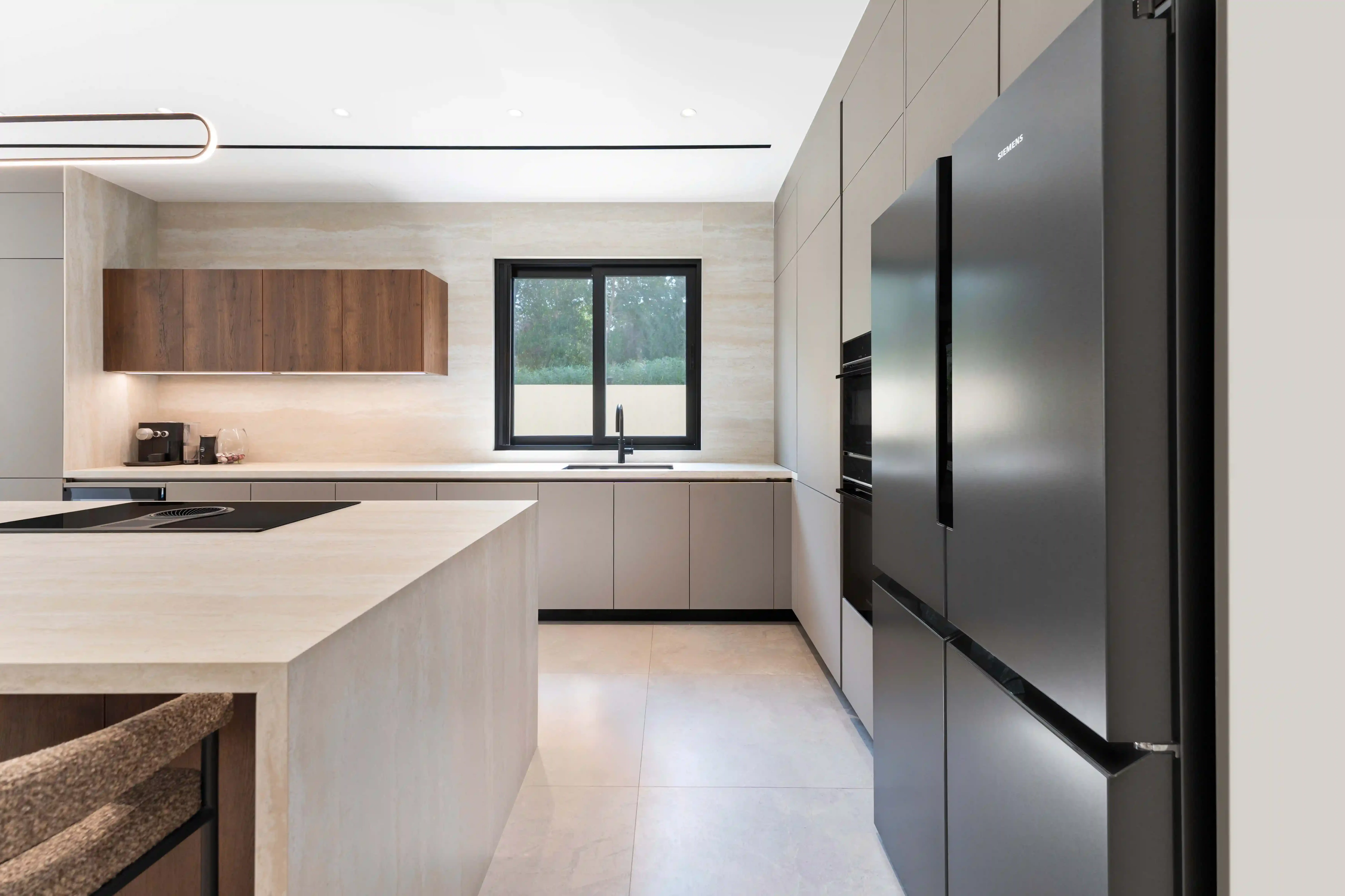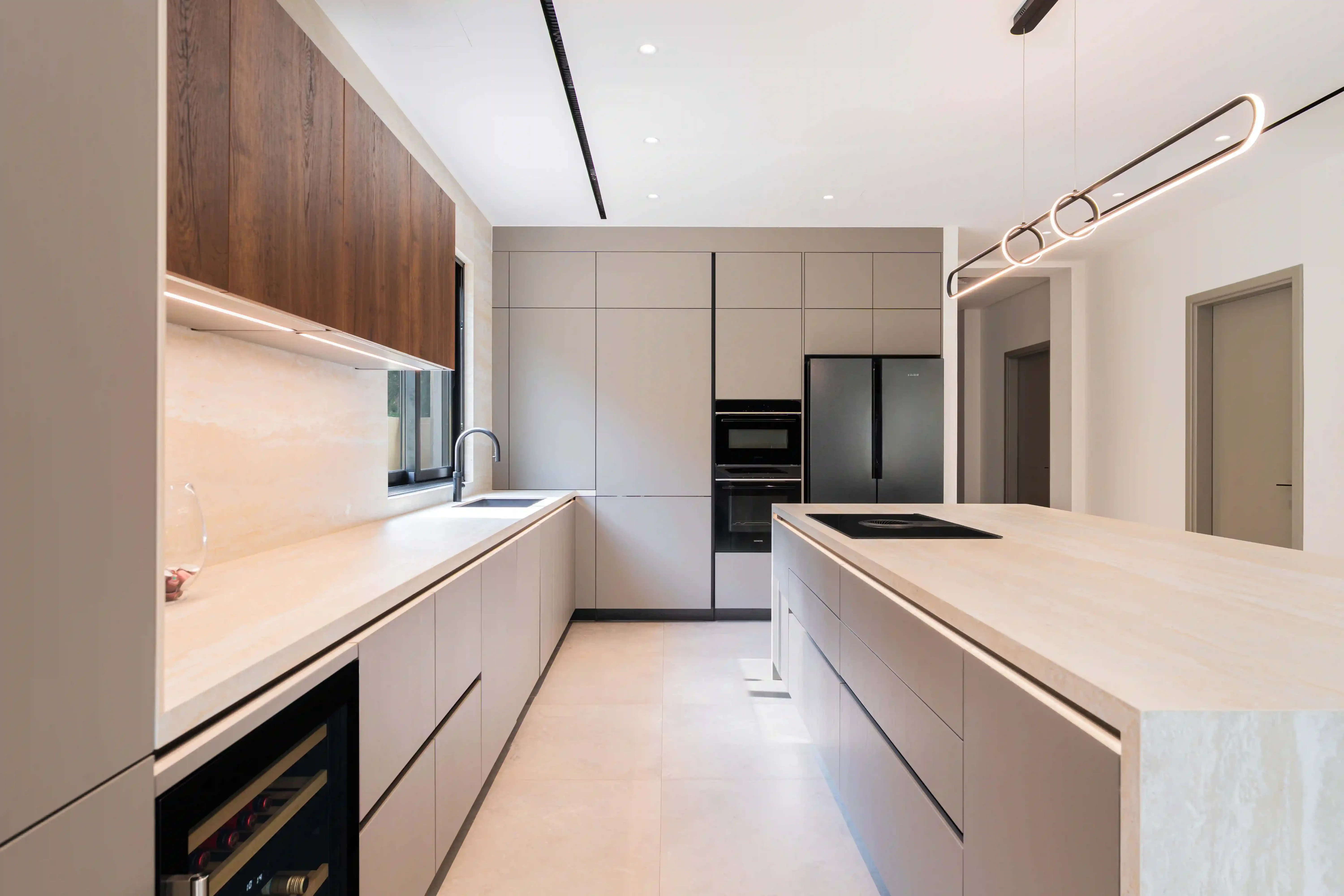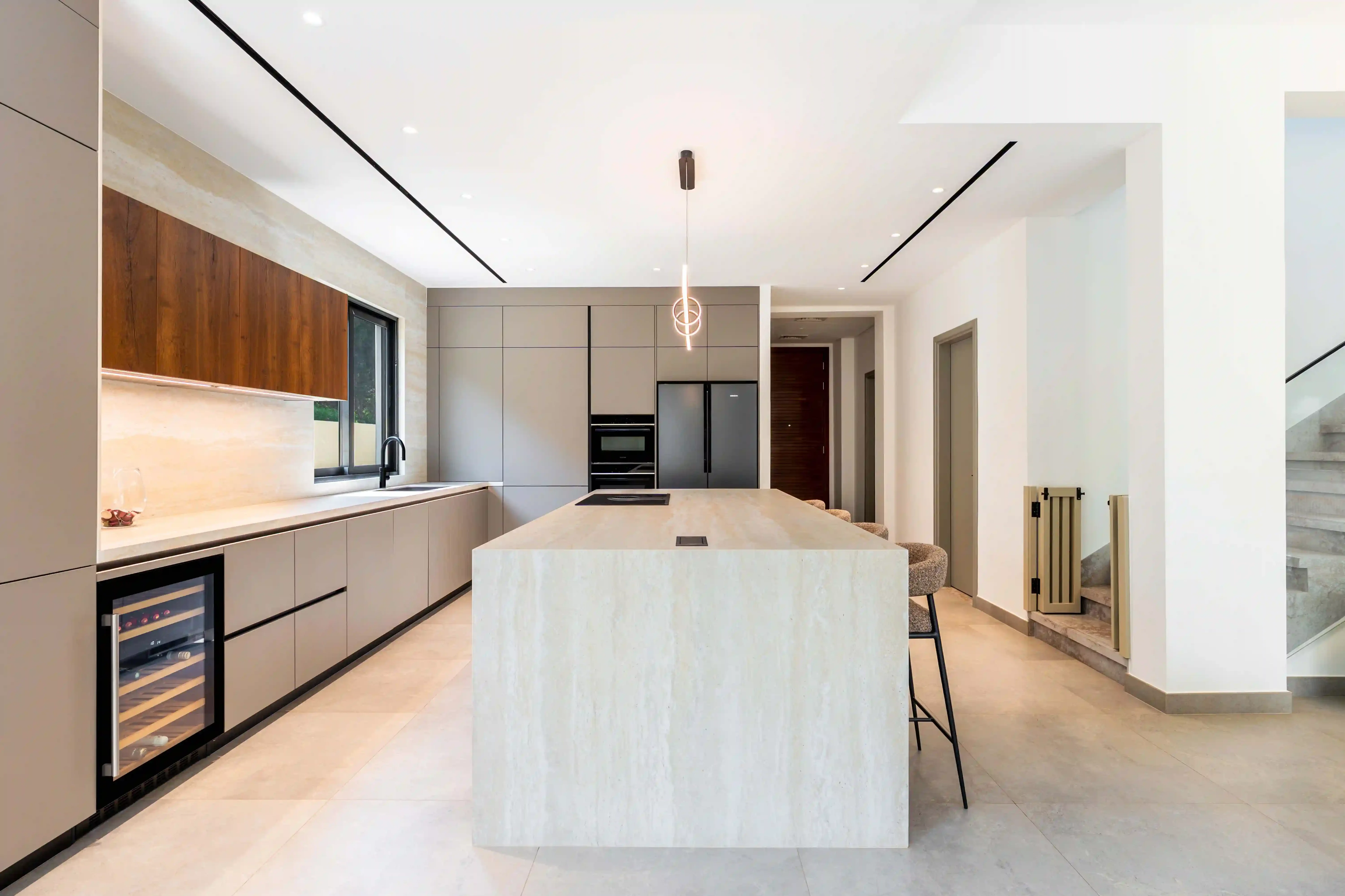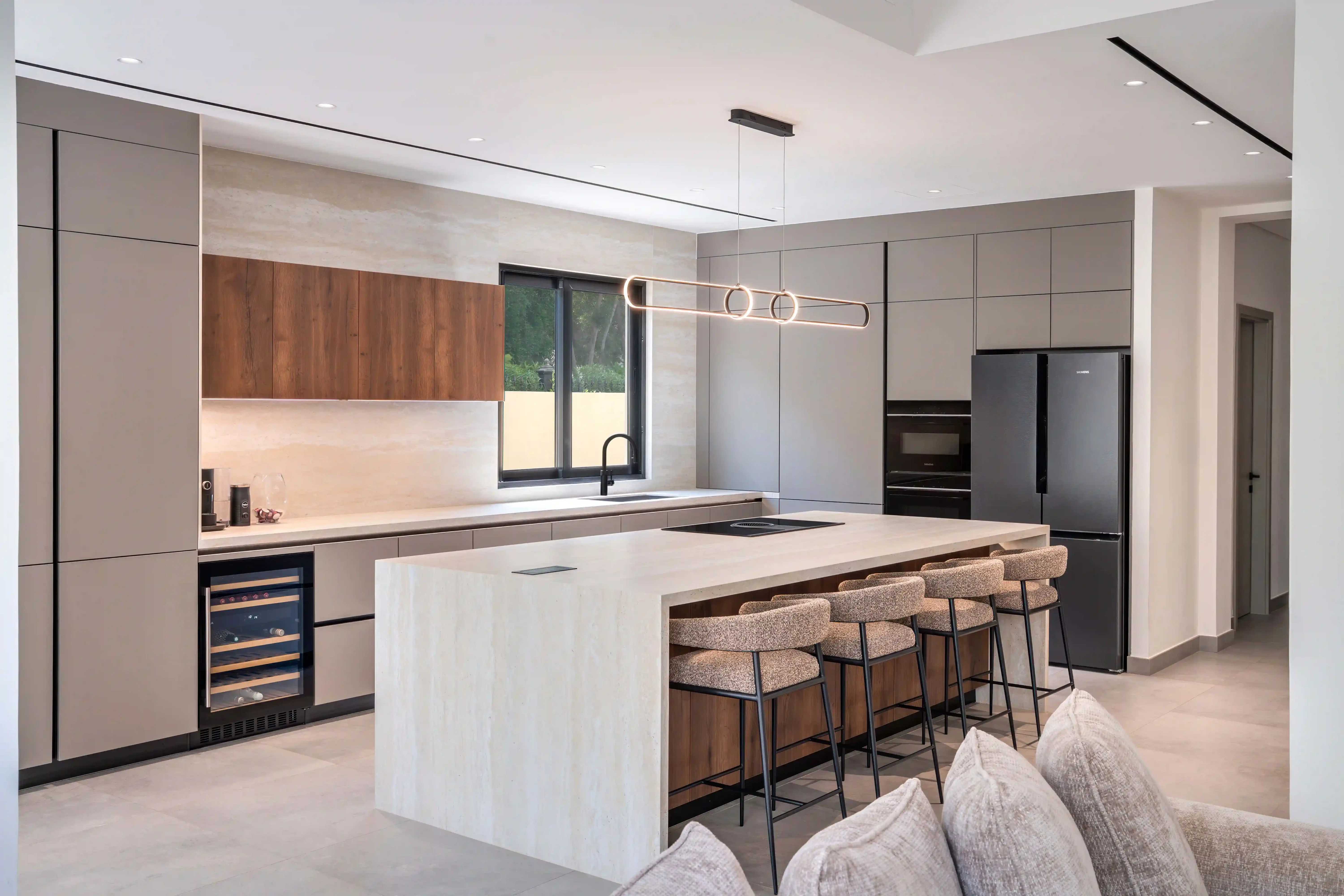 El espacio se organiza en torno a una amplia isla central que actúa como eje visual y punto de encuentro, conectando de forma natural la cocina con la zona de estar. Las líneas limpias, los electrodomésticos integrados y una paleta cromática de tonos neutros suaves potencian la sensación de amplitud y una sofisticación serena.