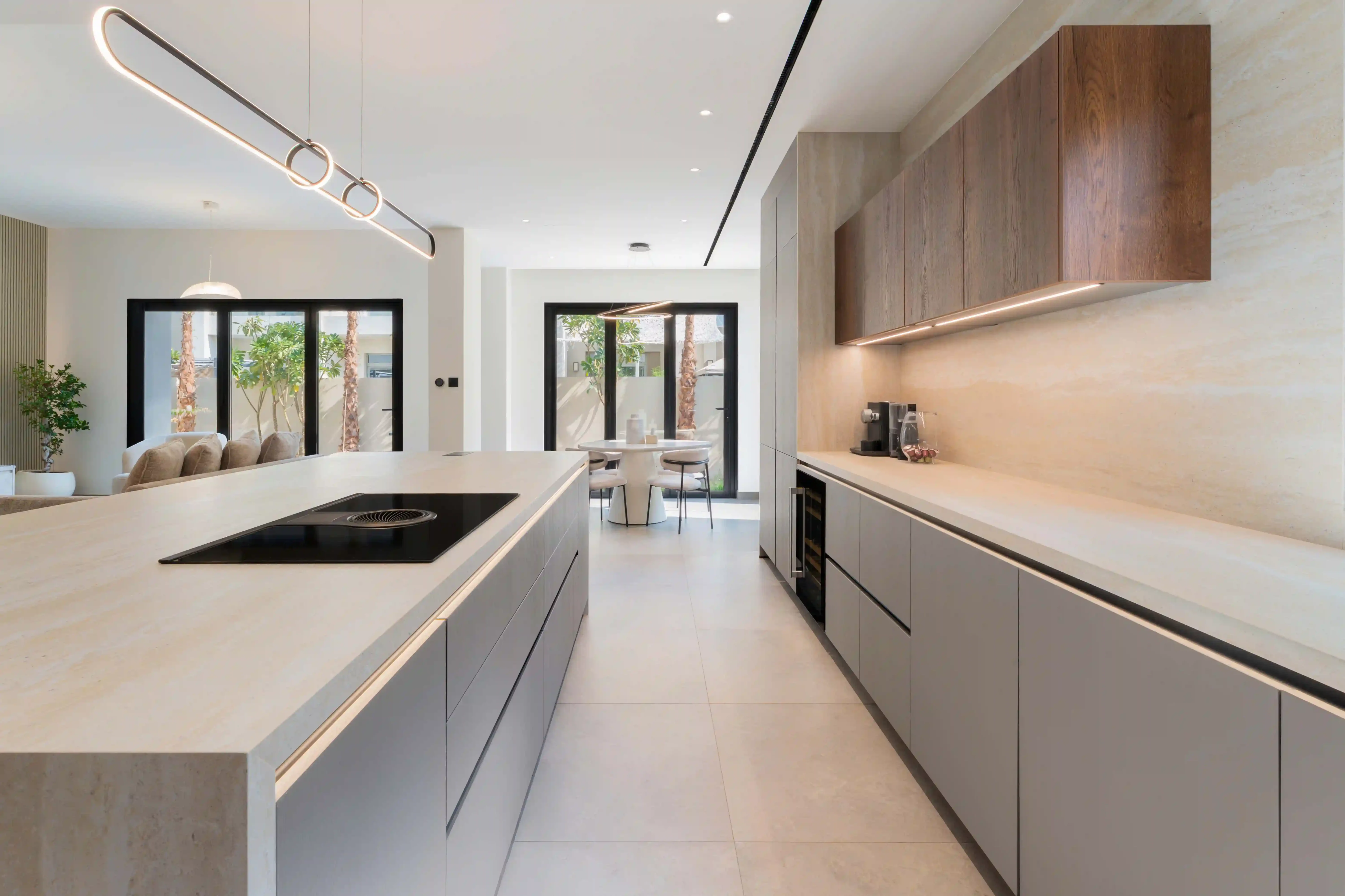 Ubicada en Arabian Ranches 2, Dubái, esta cocina diseñada por Häcker Kitchens Dubai y concebida por Rohit Patel refleja una cuidada interpretación del estilo de vida contemporáneo, donde funcionalidad y estética conviven en perfecto equilibrio.