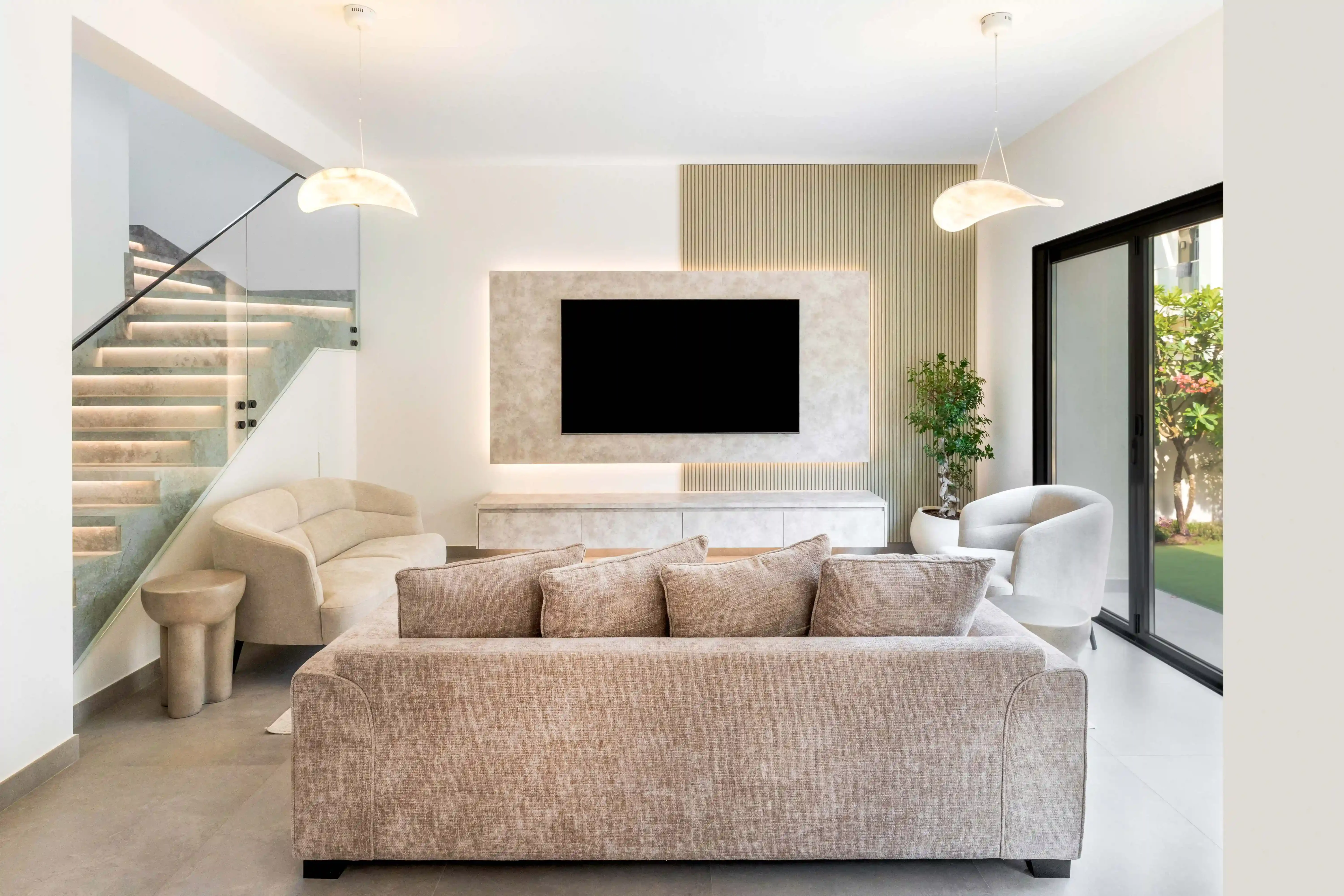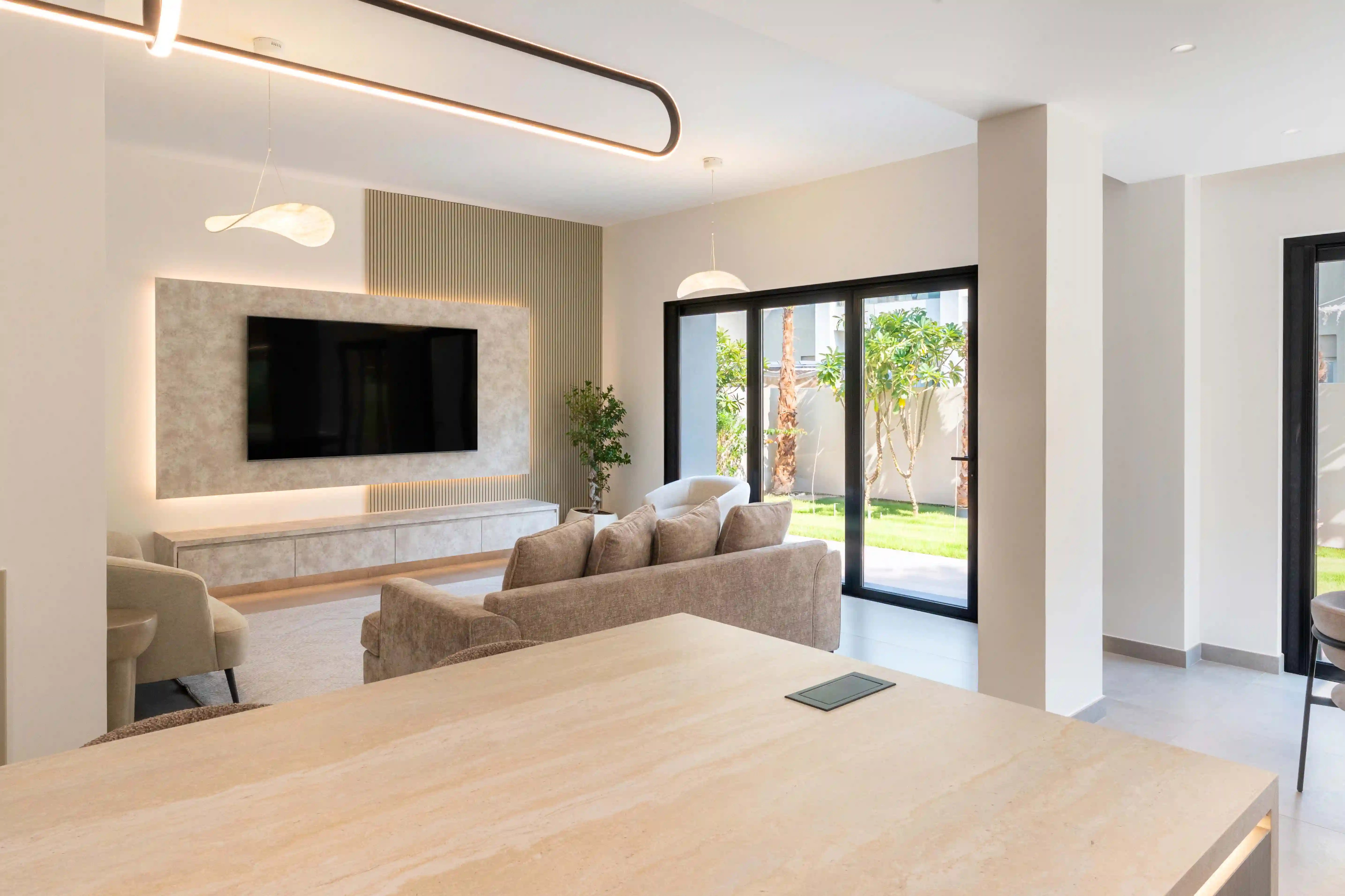 La luz natural, que entra a través de grandes aperturas hacia el exterior, realza la materialidad del espacio, destacando cada superficie y reforzando la atmósfera luminosa y calmada que define toda la vivienda.