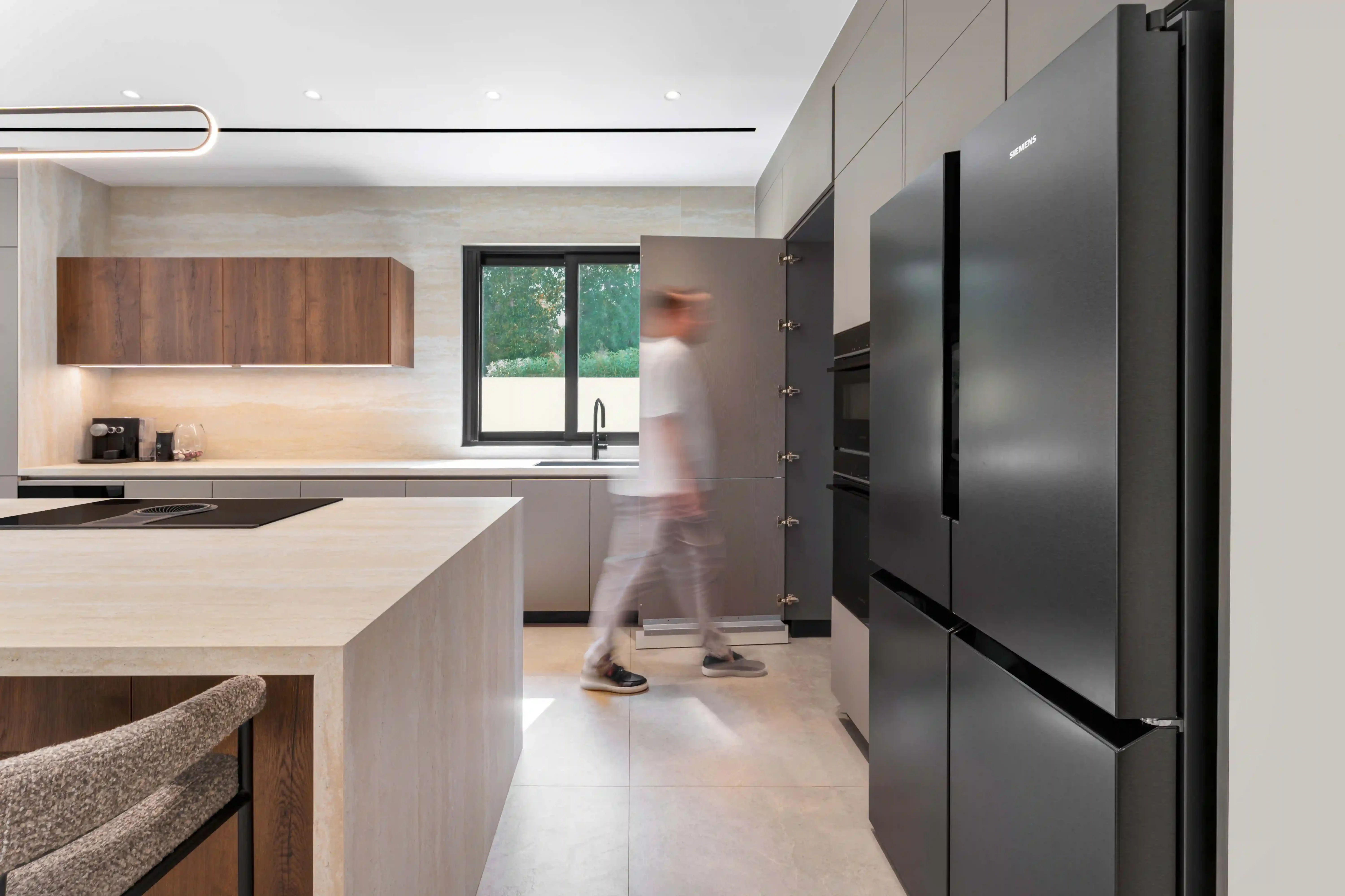 En este contexto, Tivoli White se convierte en el elemento protagonista del proyecto. Su sutil textura y sus delicadas variaciones tonales aportan profundidad y calidez al conjunto, envolviendo la isla y las superficies de trabajo en una continuidad elegante y equilibrada. Su inspiración natural dialoga con el mobiliario en tonos taupe y los detalles en madera, creando una composición atemporal y armoniosa.