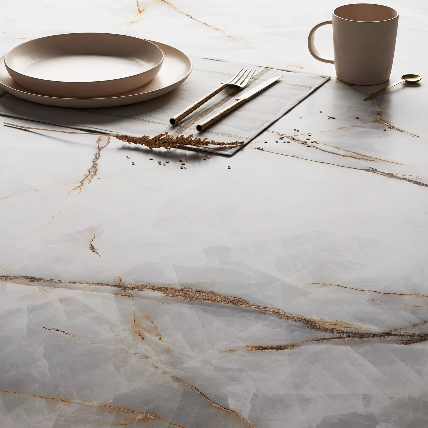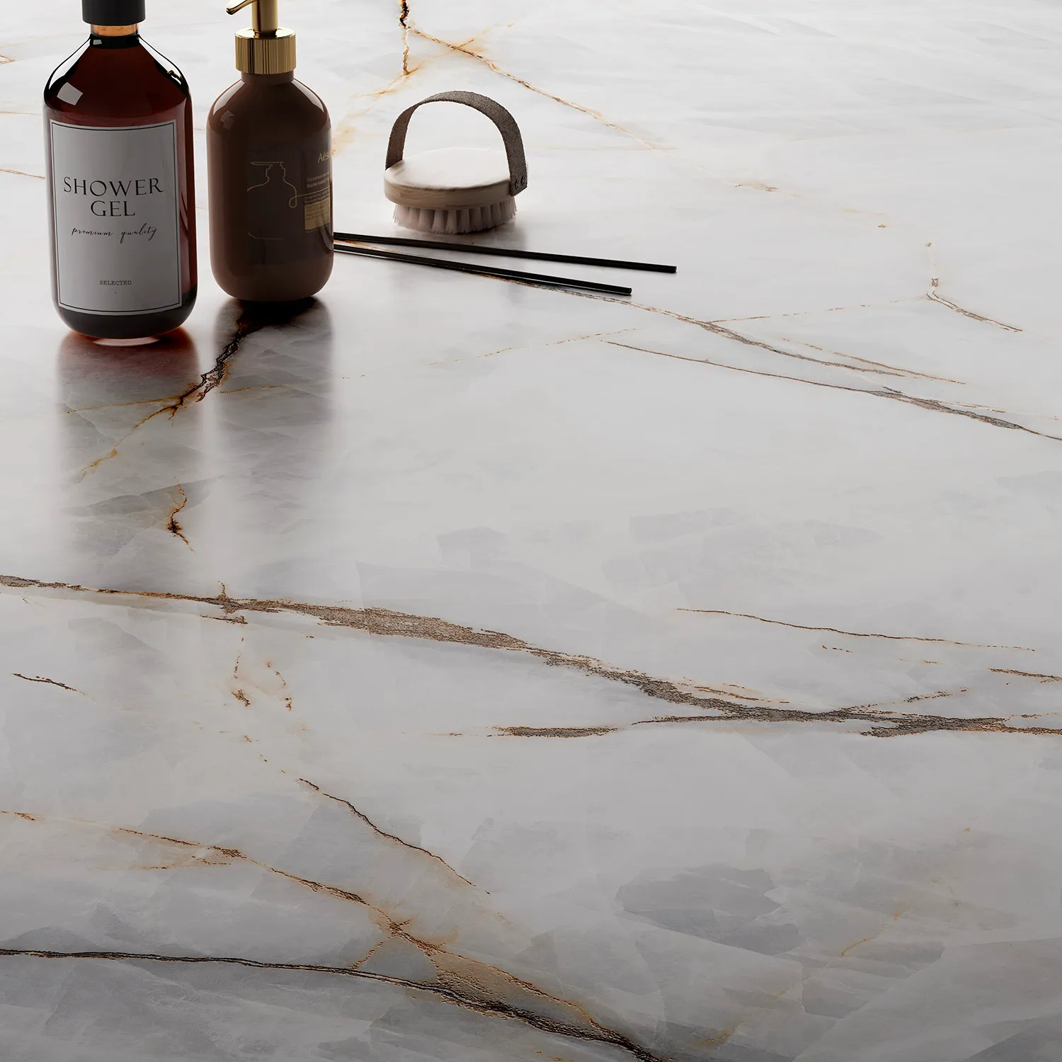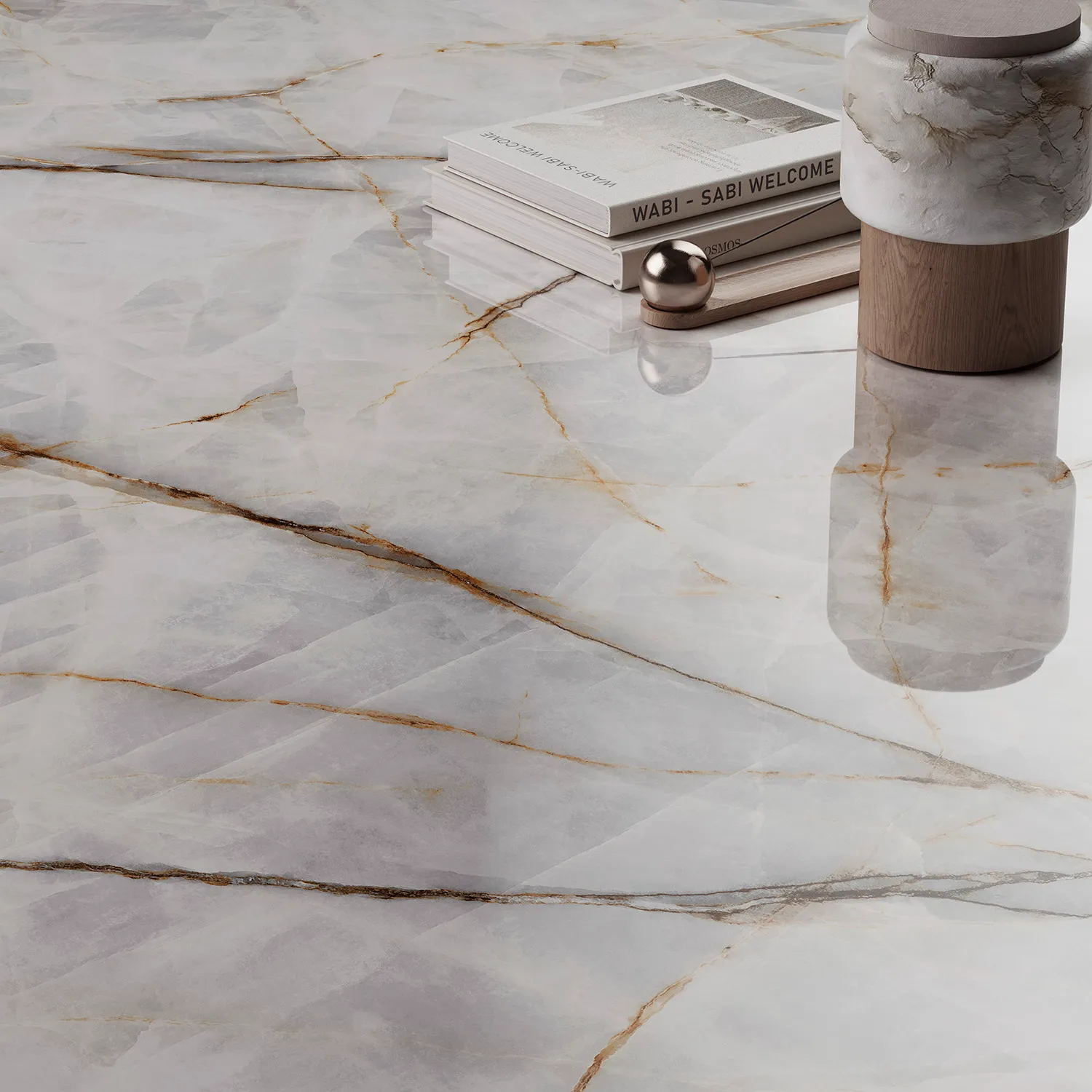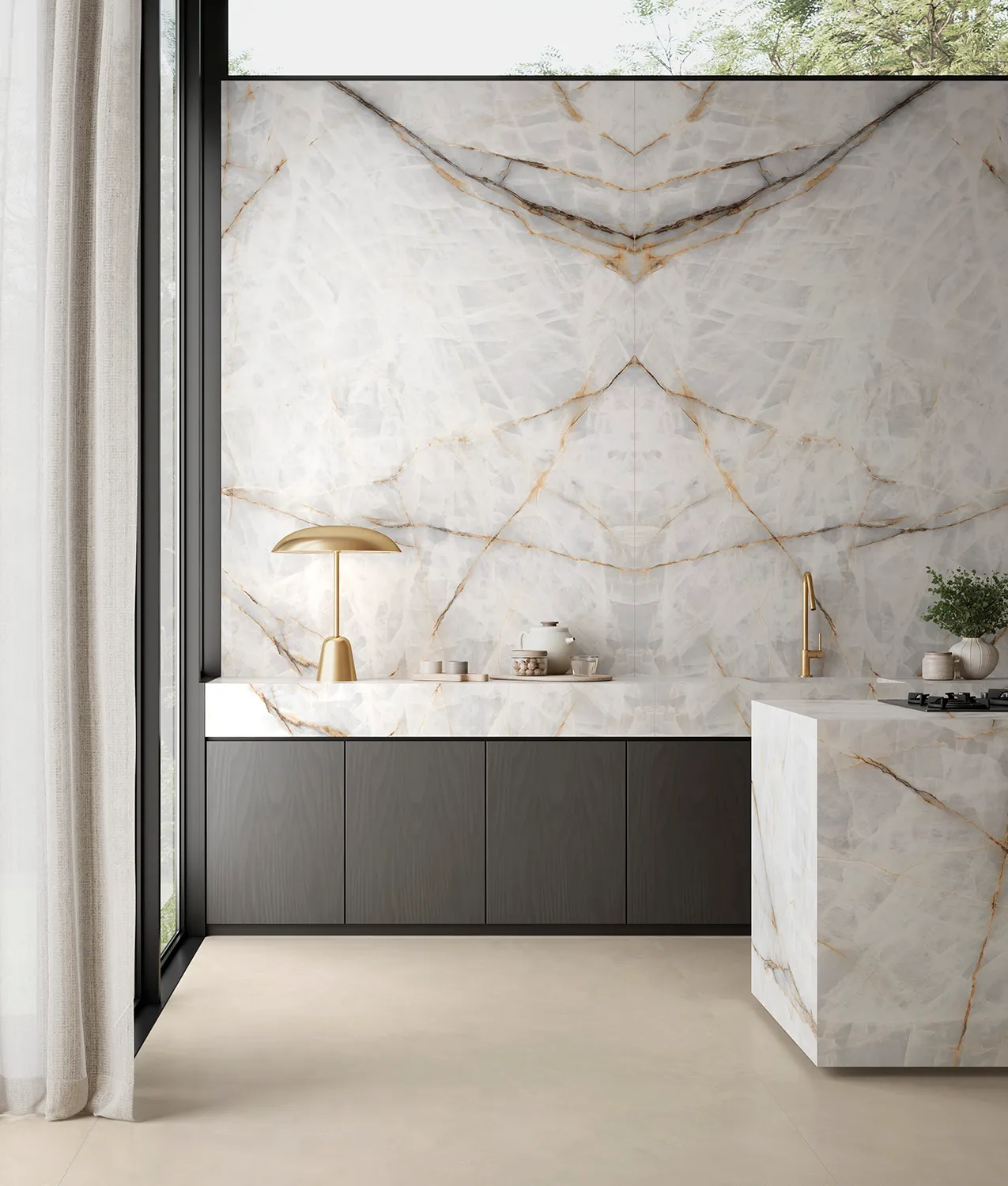 Così ogni spazio si trasforma, acquisendo profondità e carattere che evocano la sofisticatezza più pura. Le venature, come fili dorati e fumé, non solo decorano, ma guidano lo sguardo, creando una texture visiva che aggiunge dinamismo a qualsiasi ambiente.