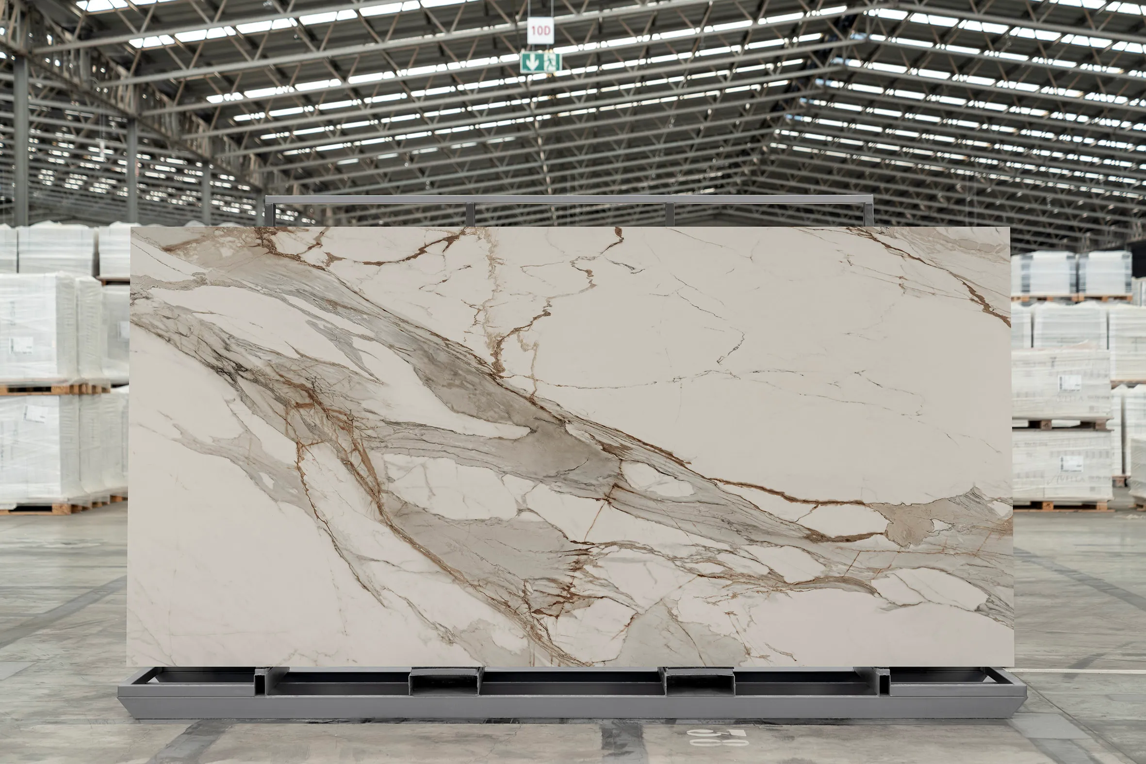 Un modelo con fondo blanco marfil y unas intensas vetas grises con reflejos anaranjados. Sin duda, un diseño agresivo y con mucha personalidad para destacar los espacios.