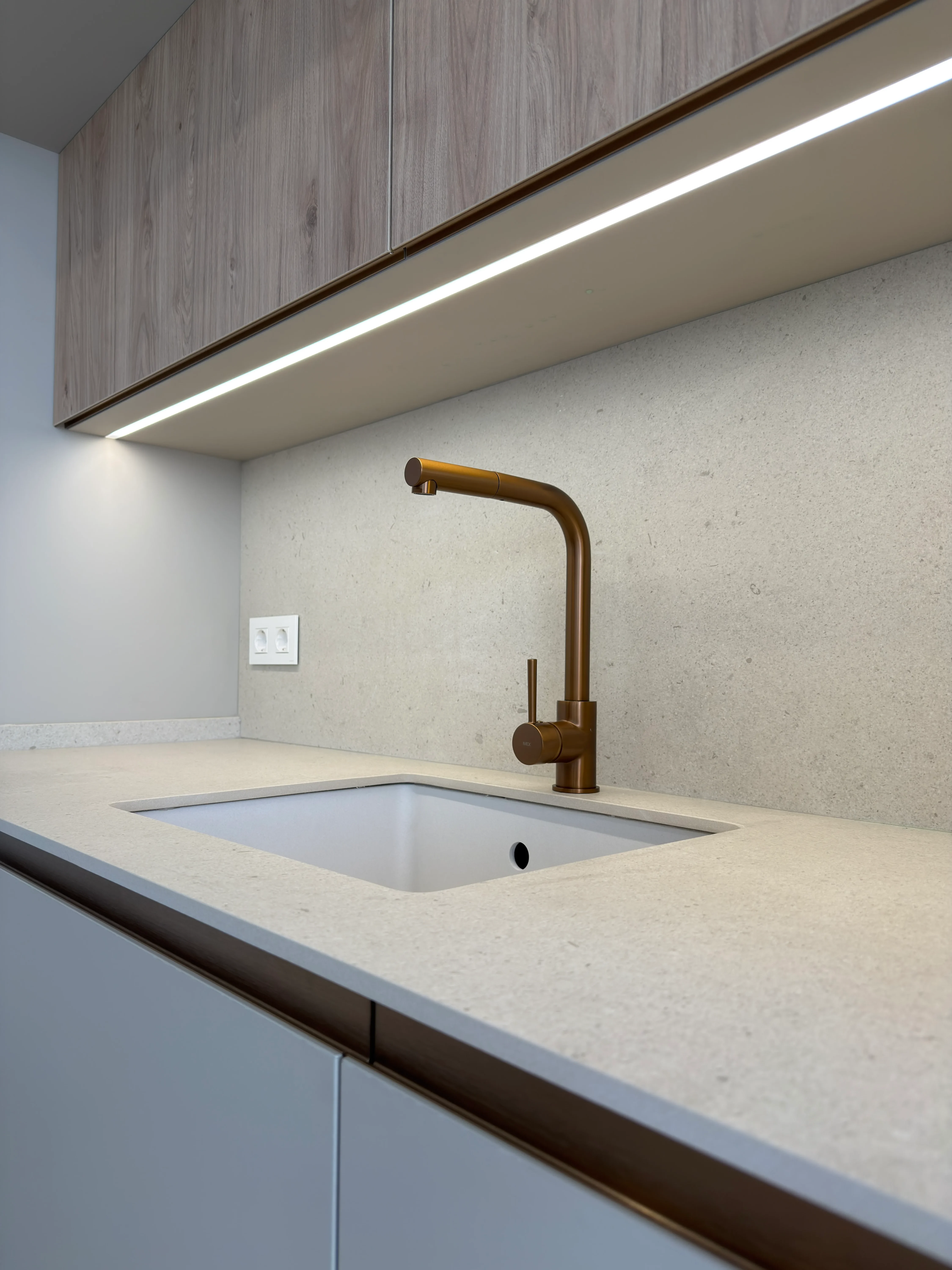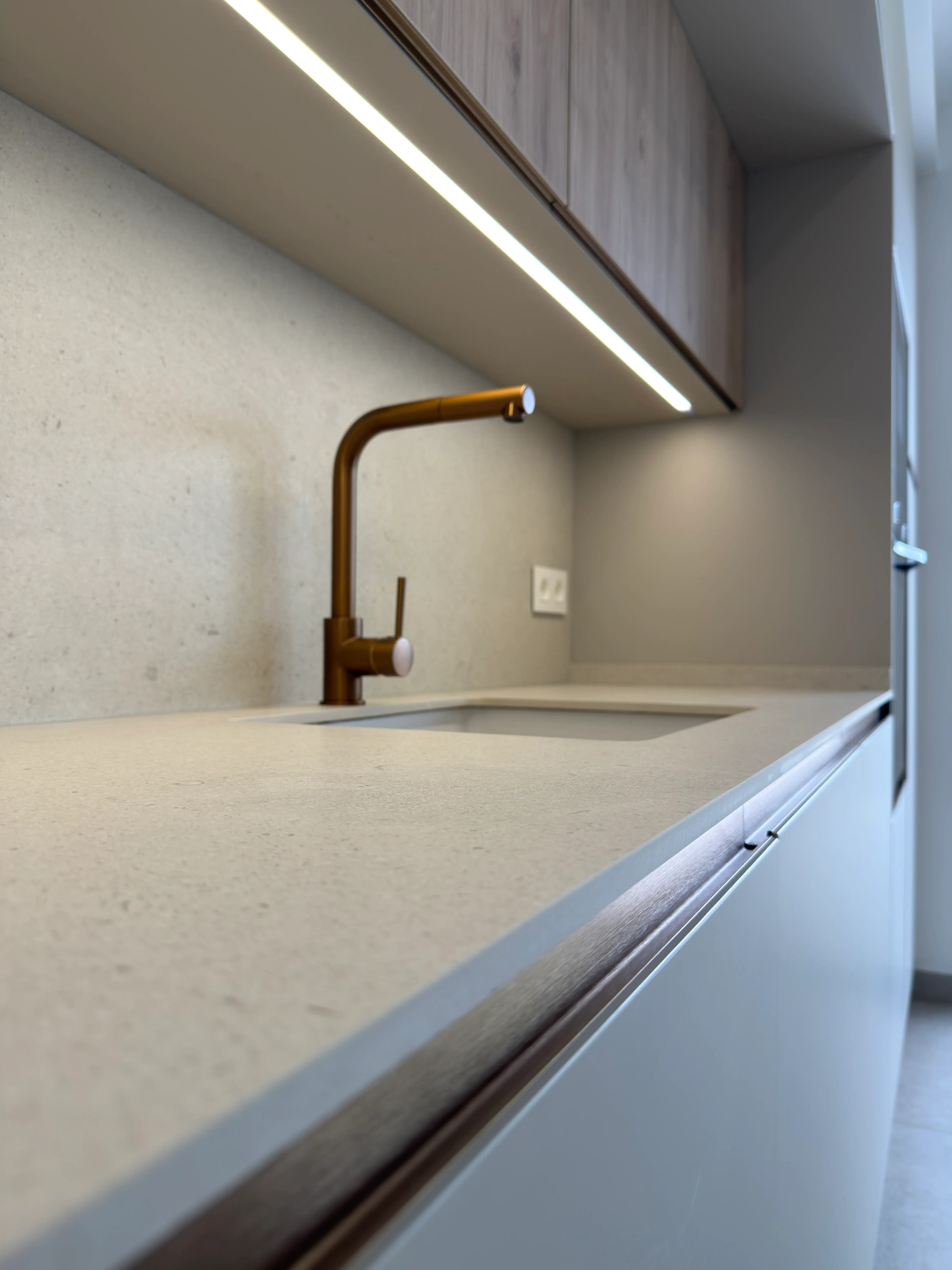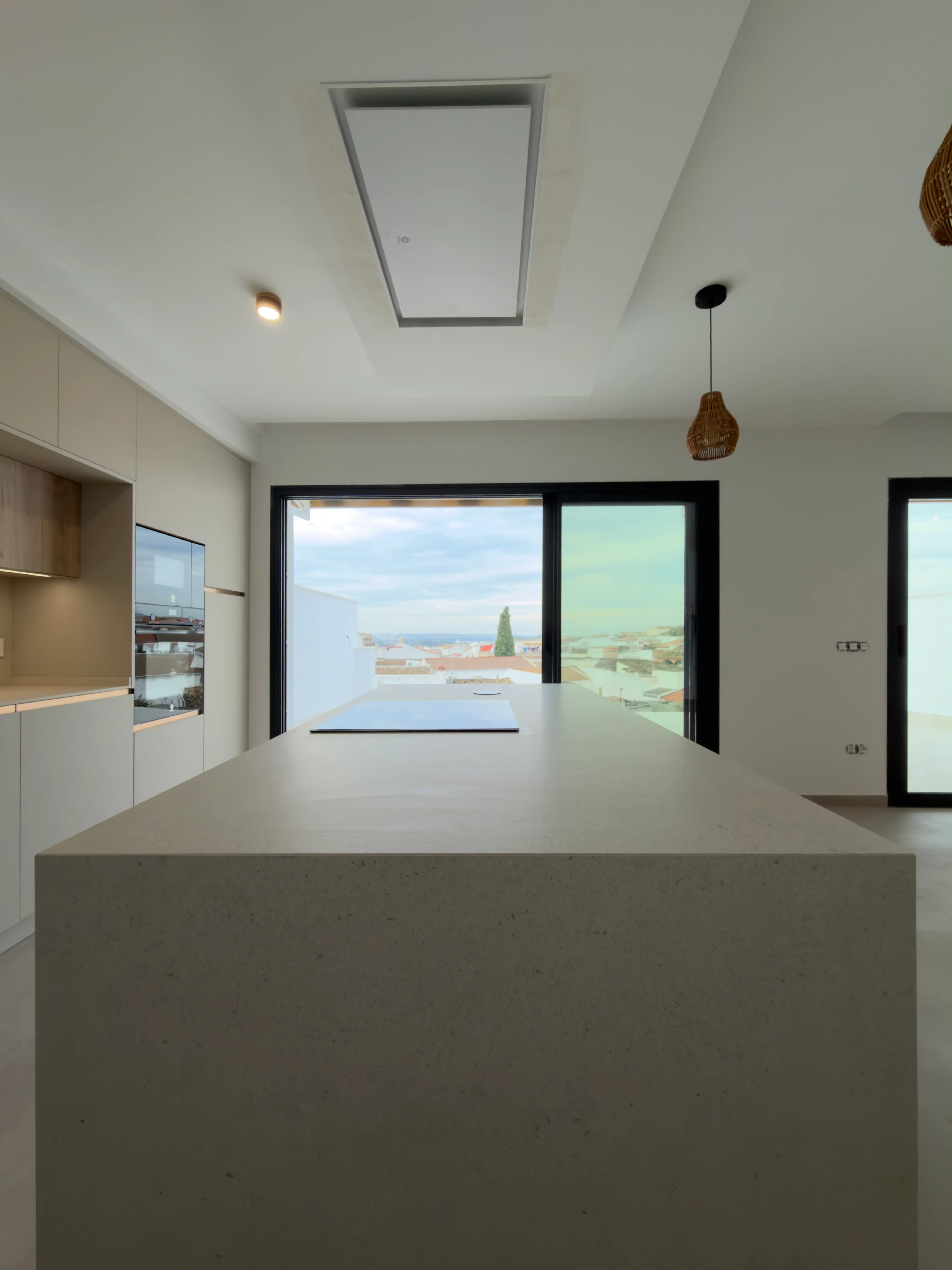 En este proyecto de cocina, la isla y la encimera en Palomastone Linen se convierten en el eje visual y funcional del espacio, aportando continuidad, luminosidad y equilibrio. Su tono claro y su gráfica suave refuerzan una estética serena que acompaña el diseño sin imponerse.